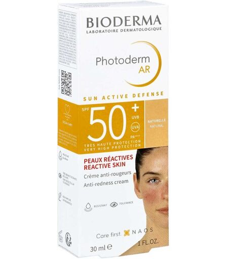 Bioderma Photoderm Ar Creme Spf 50+ ist ein sehr hoher UVA/UVB-Sonnenschutz für das Gesicht. Das Rosactiv-Patent beruhigt die Haut, mindert Rötungen und gleicht den Teint optisch aus. Die SUN ACTIVE DEFENSIVE Technologie erhält und stimuliert die natürlichen Abwehrkräfte der Haut. Ideal für empfindliche und reaktive Haut, die zu Rötungen (permanent oder vorübergehend), Rosazea oder kleinen sichtbaren Gefäßen neigt.Wirkungsweise von Bioderma Photoderm Ar Creme Spf 50+Das patentierte Wirkprinzip ROSACTIVTM (Grüner Tee + Sojaöl) reduziert die Gefäßerweiterung, reduziert Rötungen, beugt neuen vor und hilft, die Hautreaktion zu kontrollieren. Anstatt die Haut mit Filtern zu belasten, stärkt Bioderma Photoderm Ar Creme Spf 50+ ihre Eigenschutzkapazität der Haut, um die biologischen Wirkungen und um UVA-Strahlen zu kompensieren. Dieser Hightech-Sonnenschutz kombiniert UV-Filter und patentierten biologischen Schutz (Ectoin und Mannit). Es bietet antioxidativen Schutz und unterstützt die hauteigene Abwehrfunktion, schützt die zelluläre DNA und beugt lichtbedingter Hautalterung vor. Die DAFTM Sugar Base von BIODERMA ist eine Kombination aus drei beruhigenden biomimetischen Zuckern, die den Entzündungsprozess verhindern.
