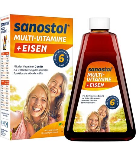 Anwendungsgebiet von Sanostol plus Eisen Saft Sanostol plus Eisen mit 9 wichtigen Vitaminen und EisenSanostol plus Eisen Saft ist ein Nahrungsergänzungsmittel mit Vitaminen und Eisen, mit Süßungsmittel Besonders bei einem Mangel an Vitaminen, Spurenelementen und Eisen ist Sanostol plus Eisen Saft ideal. Wirkstoffe / Inhaltsstoffe / Zutatenp_name enthält: Zutaten: Wasser, Verdickungsmittel Sorbit, Orangensaftkonzentrat, Malzextrakt (aus GERSTE), Süßungsmittel Acesulfam K, Grapefruitsaftkonzentrat, Vitamin C, Verdickungsmittel Xanthan, Säuerungsmittel Citronensäure, Orangenöl, Sonnenblumenöl, Eisengluconat, Konservierungsstoff Natriumbenzoat, Niacin, Pantothensäure, Vitamin E, Emulgator Polysorbat 80, Vitamin B2, Vitamin B1, Vitamin B6, Vitamin A, Vitamin D. Nährstoffein 10 ml % der Referenzmenge* pro 10 ml Vitamin A 600 µg RE 75 % Vitamin D 5 µg 100 % Vitamin E 5 mg ɑ-TE 42 % Vitamin C 60 mg 75 % Vitamin B1 0,6 mg 55 % Vitamin B2 0,8 mg 57 % Vitamin B6 0,7 mg 50 % Niacin 9 mg NE 56 % Pantothensäure 4 mg 67 % Eisen 3,3 mg 24 % * gemäß Lebensmittelinformationsverordnung GegenanzeigenBei bekannter Überempfindlichkeit gegenüber einem der oben genannten Inhaltsstoffe sollte das Produkt nicht verwendet werden. DosierungVerzehrempfehlungvon Sanostol plus Eisen Saft: Kinder ab 6 Jahre, Jugendliche und Erwachsene nehmen täglich 10 ml (1 Messlöffel). HinweiseDas Produkt enthält Vitamin A. Schwangere Frauen und Frauen, bei denen eine Schwangerschaft nicht ausgeschlossen werden kann, sollten vor dem Beginn des Verzehrs ihren Arzt befragen. Kann bei übermäßigem Verzehr abführend wirken. Nahrungsergänzungsmittel sind kein Ersatz für eine ausgewogene und abwechslungsreiche Ernährung. Sanostol plus Eisen Saft sollte außerhalb der Reichweite von Kindern aufbewahrt werden. Die täglich empfohlene Verzehrmenge sollte nic ...