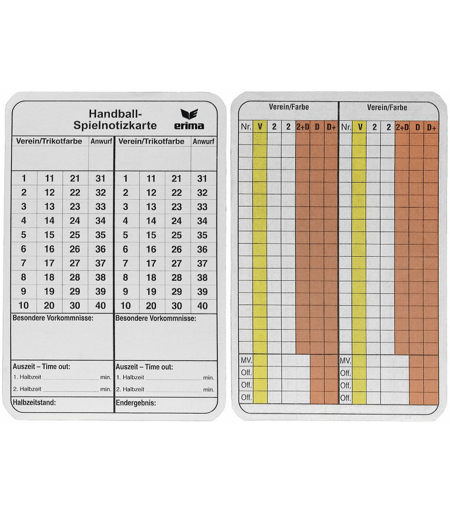 Erima Spielnotizkarten Handball vorgedruckter Schreibkarton 12 x 8 cm wichtiger Bestandteil zum Auffüllen des Schiedsrichter-Sets und des Mini-Sets Set mit 50 Karten ...