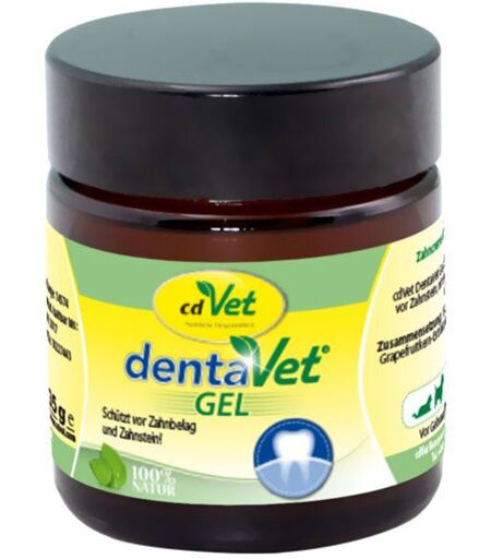 Ergänzungsfuttermittel zur Unterstützung der Mundhygiene bei Hunden ProduktbeschreibungdentaVet Gel, die schonende Zahnpflege für Ihr Tier. Auch bei Hund und Katze sollte eine regelmäßige Zahnpflege selbstverständlich sein. Ebenso wie beim Mensch, können sich bei ihnen Plaque und Zahnstein bilden. Nicht jedes Tier hält aber freiwillig still, wenn man sich mit einer Zahnbürste dem Maul nähert. Hier bietet dentaVet Gel eine hervorragende Alternative. Durch die einfache Anwendung (kurz auftragen, das Putzen erledigt das Tier alleine), wird die tägliche Zahnpflege zur stressfreien Angelegenheit. Auch die hochwertigen Zusammensetzung liefern dafür ihren Beitrag. Zeolith kann, wie viele Mineralerden, als rein natürlicher Filter wirken. Seine bindende Eigenschaft harmonisiert die Maulflora, indem es Bakterien und Säuren absorbiert. Durch die natürlichen, feinen Reibekörper des Eierschalenpulvers werden Beläge sanft entfernt, ohne dabei den empfindlichen Zahnschmelz anzugreifen oder zu schädigen. Diese Kombination, in Verbindung mit den wertvollen ätherischen Ölen aus Weihrauch und Fenchel, entfernt schonend Plaque und dringt bis tief in die Maulhöhle vor. Tipp: Zum Auftragen eignet sich am besten eine Mullbinde oder ein Mikrofasertuch. Zieltierart: Hunde und Katzen. Expertentipp: Mangelnde Zahn- und Maulpflege mit ungeeigneten Produkten haben oft Zahnfleischentzündungen sowie Maulfäule zur Folge. dentaVet Gel enthält natürliche Pflegesubstanzen, die eine optimale Maulhygiene begünstigen. Bei regelmäßiger Anwendung werden die Zähne schonend gereinigt und vor Zahnbelag geschützt. Durch dentaVet Gel wird unangenehmer Atemgeruch reduziert. dentaVet Gel reinigt und pflegt die Zähne, schützt vor Zahnbelag und Zahnstein, nimmt unangenehmen Atemgeruch und unterstützt die natürliche Maulflora.Pflegemittel für TiereZusammensetzung: Bio-Hanföl, Zeolith, Eierschalenpulver, Grapefruitkernextrakt, Weihrauchöl, Salbeiöl, Sternanisöl, Fenchelöl, Thymianöl, NelkenölAnwendungsempfehlung: 2 mal wöchentlich gleichmäßig auf Zähne und Zahnfleisch auftragenVor Gebrauch umrühren. Kühl und dunkel lagern! ...