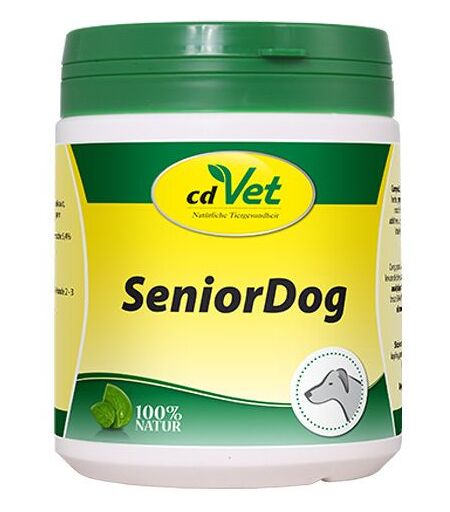 Ergänzungsfuttermittel für Hunde im höheren Alter cdVet SeniorDog ist ein natürliches Ergänzungsfuttermittel für Hunde und versorgt den Körper des Tieres mit wertvollen Kräutern, Vitamin E, Selen, Aminosäuren, Elektrolyten, essentiellen Fettsäuren und Eisen. cdVet SeniorDog ist besonders empfehlenswert um Fütterungsbedingte Defizite bei allgemeiner Schwäche, Lustlosigkeit, nach Krankheiten oder Operationen, nach Trainingspausen, bei Mangel an Agilität und bei älteren Tieren auszugleichen. Eine optimale Versorgung mit Vitaminen, Spurenelementen, Aminosäuren und ausgesuchten Kräutern unterstützt die, insbesondere bei älteren Hunden, häufig geschwächten physiologischen Organfunktionen und Stoffwechselvorgänge. Empfehlung: Zur Mikronährstoffversorgung ist zusätzlich die Fütterung von cdVet MicroMineral ratsam. Ergänzungsfuttermittel für Hunde.Zusammensetzung: Leinsamen, Biertreber, Weißdorn, Bierhefe, Mariendistelkraut, Birkenblatt, Brennnesselkraut, Ginkgo, Löwenzahn, Ingwer. Analytische Bestandteile und Gehalte: Rohprotein 31,2%, Rohfett 15,4%, Rohfaser 11,5%, Rohasche 5,4%Analytische Bestandteile je kg: Fütterungsphysiologische Analytische Bestandteile: L-Lysin-Monohydrochlorid 130g, DL-Methionin 55gFütterungsempfehlung: täglich 1 - 2 Messlöffel, je nach Körpergewicht, über das Futter geben 1 Messlöffel entspricht ca. 3,2g ...