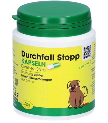 cdVet Durchfall Stopp Kapseln für Hunde und Katzen cdVet Durchfall Stopp ist ein diätetisches Ergänzungsfuttermittel in Kapselform zur Linderung akuter Resorptionsstörungen des Darms bei Hunden und Katzen. Es enthält unter anderem präbiotische Hefe, die zur Stabilisierung der Darmflora beiträgt. Die Kapseln fördern die Regeneration nach Durchfallerkrankungen und können die Darmgesundheit nachhaltig unterstützen. Zusammensetzung/Inhaltsstoffe: Dextrose, Bierhefezellwände (MOS), Totes Meer Salz, Queckenwurzel, Kohlenhydratquelle: Traubenzucker. Zusatzstoff je kg: Technologische Zusatzstoffe: Bentonit (1m558) 250 g. Analytische Bestandteile: Rohprotein 6,7 %, Rohfett 1,3 %, Rohfaser 1,4 %, Rohasche 29,2 %, Kalium 0,99 %, Salz 2,65 %, unlösliche Asche in HCl 20,0 %. Dosierung: Dem Futter täglich für 1–7 Tage beifügen. Katzen: 2 Kapseln pro Tier. Bei Bedarf kann die Anfangsdosis verdoppelt werden. Für eine schnellere Wirkung kann die Kapsel geöffnet und das Pulver direkt verfüttert werden. Empfohlene Höchstmenge von Durchfall Stopp: 80 g/100 kg Körpergewicht täglich. Aufbewahrung/Hinweise: Trocken und kühl lagern. Während der Fütterung wird empfohlen, den Rat eines Tierarztes einzuholen. Nicht bei gleichzeitiger Verabreichung von Makroliden verwenden. ...