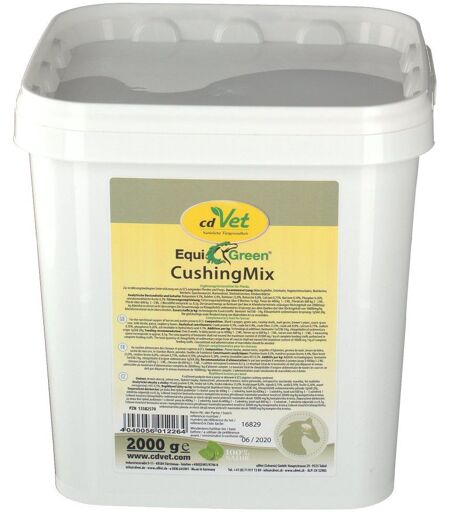 Ergänzungsfuttermittel zur Unterstützung bei Stoffwechselproblemen bei Pferden EquiGreen CushingMix ist speziell auf die ernährungsbedingten Bedürfnisse von Pferden und Ponys mit Stoffwechselproblemen ausgerichtet. Es enthält wichtige Vitalstoffe aus rein natürlichen Quellen, welche leicht verfügbar sind und den in diesen Fällen ohnehin strapazierten Organismus und seine Entgiftungsorgane nicht noch weiter belasten.Mit seiner ausgewogenen Zusammensetzung auf der Basis von Mönchspfeffer, Grünhafer und einigen ausgewählten Kräutern stellt EquiGreen CushingMix eine ideale Futterergänzung für betroffene Tiere dar.Ergänzungsfuttermittel für PferdeZusammensetzung:Mönchspfeffer, Grünhafer, Hagebuttenschalen, Malzkeime, Bierhefe, Queckenwurzel, Mariendistel, Stiefmütterchen, HimbeerblätterAnalytische Bestandteile und Gehalte:Rohprotein 9,3%, Rohfett 4,4%, Rohfaser 23,0%, Rohasche 8,8%, Calcium 0,75%, Natrium 0,10%, Phosphor 0,26%, salzsäureunlösliche Asche 4,5%Analytische Bestandteile je kg:technologische Analytische Bestandteile: Bentonit 1m558i 34g, Klinoptilolith sedimentären Ursprungs 1g568 20gFütterungsempfehlung:über 8 Wochen 1x tägl. Ponys bis 400kg 1 - 2 ML, Pferde bis 600 kg 2 - 3 ML, Pferde über 600 kg 3 - 5 Messlöffel 1 Messlöffel entspricht ca. 8,5gDie Gesamtmenge an Bentonit darf den in Alleinfuttermitteln zulässigen Höchstgehalt von 20000mg/kg Alleinfuttermittel nicht übersteigen.Die Gesamtmenge an Klinoptilolith sedimentären Ursprungs aus allen Quellen darf den Höchstgehalt von 10000mg/kg Alleinfuttermittel nicht überschreiten.Die gleichzeitige orale Verabreichung von Makroliden ist zu vermeiden ...