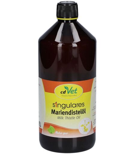 cdVet singulares Mariendistelöl Mariendistelöl (Silymarin-haltiges Futteröl) zur Unterstützung der Leberfunktion Die Mariendistel ist eine Heilpflanze, die für ihre zahlreichen positiven Eigenschaften weithin bekannt ist. Silymarin (ein Komplex aus Flavonolignanen) heißt das Zauberwort, wenn es um die leber- und galleunterstützenden Eigenschaften der Mariendistel geht. Dieses ist in der Pflanzenwelt einzigartig und regt die Produktion der Gallenflüssigkeit an, wodurch eine bessere Aufspaltung von Nährstoffen gewährleistet wird. Außerdem verhindert es die Aufnahme von Giftstoffen durch die Zellmembranen der Leber und bindet freie Radikale. So wird die Leber in ihrer natürlichen Fähigkeit zur Regeneration unterstützt und angeregt. Zudem enthält die Mariendistel einen hohen Anteil an Vitamin E, Omega-6- und -9-Fettsäuren. Mariendistel ist eine gut verwertbare Energiequelle für Tiere und sorgt für eine gesunde Verdauungsfunktion. Fütterungsempfehlung: Täglich dem Futter beifügen. Katzen, Hunde: 1,5-3 ml/5 kg Körpergewicht. Pferde: 15-30 ml/100 kg Körpergewicht. 1 TL entspricht ca. 5 ml / 1 EL = ca. 15 ml. Nach dem Öffnen gekühlt und dunkel aufbewahren und innerhalb von 6 Wochen verbrauchen! Zusammensetzung: Mariendistelöl 100%, kalt gepresst Analytische Bestandteile Durchschnittlicher Fettsäuregehalt: Linolsäure 52% ...