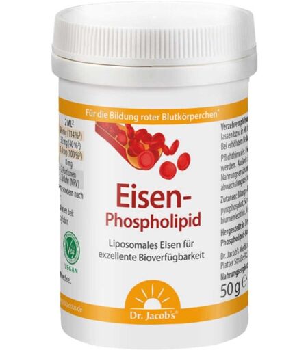 Anwendungsgebiet von Dr. Jacob's Eisen-Phospholipid Mango Pulver liposomal veganDas in Dr. Jacob's Eisen-Phospholipid Mango Pulver liposomal vegan enthaltene Eisen leistet einen wissenschaftlich gesicherten Gesundheitsbeitrag zu den folgenden normalen Körperfunktionen: Kognitive Funktion (Denken, Konzentration) Bildung von Hämoglobin und roten Blutkörperchen Sauerstofftransport im Körper Verminderung von Müdigkeit Energiestoffwechsel und Immunsystem Kognitive Entwicklung von Kindern Das zusätzlich in Dr. Jacob's Eisen-Phospholipid Mango Pulver liposomal vegan enthaltene Vitamin B2 unterstützt den normalen Eisenstoffwechsel und das enthaltene Vitamin C erhöht die Aufnahme von Eisen. In jeder Zelle unseres Körpers befinden sich Phospholipide – auch in den Darmzellen. Das Eisen in unserem Produkt wird von Phospholipiden in Form von Liposomen umschlossen. Phospholipide erleichtern die Aufnahme von Eisen im Darm, da die Wände der Liposomen ähnlich aufgebaut sind wie die Membranen unserer Zellen.Wirkstoffe / Inhaltsstoffe / ZutatenZutaten von Dr. Jacob's Eisen-Phospholipid Mango Pulver liposomal vegan: Mango-Fruchtpulver (47 %), Eisen-Phospholipid-Komplex (Eisenpyrophosphat, Sonnen-blumenlecithin) (20 %), Acerola-Kirschextrakt, Sonnenblumenlecithin, Kieselerde, Riboflavin. Hergestellt in Deutschland. Eisen-Phospholipid-Komplex aus Japan. Vegan. Nährwerte durchschnittlich pro: 1 ML* 2 ML** Eisen 8 mg (57 %***) 16 mg (114 %***) Vitamin C 16 mg (20 %***) 32 mg (40 %***) Vitamin B2 0,7 mg (50 %***) 1,4 mg (100 %***) Silicium 4 mg 8 mg* Messlöffel (ML) = 1 Portion (0,5 g) ** 2 ML = 2 Portionen (1 g Tagesdosis) ***Referenzmengen für die tägliche Zufuhr (NRV) GegenanzeigenBei bekannter Überempfindlichkeit gegenüber einem der oben genannten Inhaltsstoffe sollte dieses Produkt nicht angewendet werden.DosierungVerzehrempfehlung von Dr. Jacob's Eisen-Phospholipid Mango ...