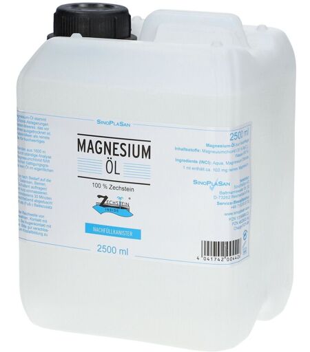 100 % ZechsteinDieses besondere Magnesium-Öl stammt aus den Magnesium-Chlorid-Ablagerungen des ehemaligen Zechstein-Meeres, das vor etwa 250 Millionen Jahren ausgetrocknet ist.Weltweit gilt das Zechstein-Meer als reinste und natürlichste Quelle für hochwertiges Magnesiumchlorid.Es wird in den Niederlanden aus 1600 m Tiefe gewonnen und durch ständige Analyse qualitätsüberwacht.Magnesiumchlorid fühlt sich aufgrund seines hohen Sättigungsgrades ölig an, obwohl es kein Öl im eigentlichen Sinne ist.Anwendung:Täglich je nach Bedarf auf die Haut z.B. an Muskeln, Gelenken, Beinen, Armen, Rücken oder Schultern auftragen/sprühen, anschließend kurz einmassieren.Die Einwirkzeit sollte mindestens 30 Minuten betragen und kann anschließend abgeduscht werden.Es kann auch als (Fuß-) Badezusatz verwendet werden.Hinweis:Außerhalb der Reichweite von kleinen Kindern aufbewahren.Kontakt mit den Augen vermeiden.Bei Augenkontakt mit viel Wasser ausspülen.Bitte gut verschlossen über 5 °C lagern um Kristallbildung zu vermeiden.Inhaltsstoffe:Magnesiumchlorid (31 % MgCI2), Wasser (69 %) ...
