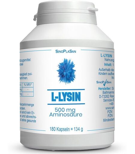 Nahrungsergänzungsmittel sind kein Ersatz für eine ausgewogene und abwechalungsreiche Ernährung und eine gesunde Lebensweise.L-Lysin ist eine essentielle Aminosäure, die täglich über die Nahrung aufgenommen werden muss.Sie kann vom Körper nicht selbst produziert werden. L-Lysin ist vor allem in tierischen Lebensmitteln enthalten und sollte daher besonders von Veganern und Vegetariern supplementiert werden.Auch Sportler haben einen erhöhten Bedarf. Lysin ist im Bindegewebsprotein Kollagen enthalten, welches wiederum für die Knorpel, die Haut, die Haare, die Knochen, die Zähne, die Muskeln und die Sehnen wichtig ist.Unser Körper ist ein Wunderwerk, das wird einem immer wieder deutlich, wenn man einen genauen Blick auf die Zusammenhänge wirft, auf die vielen kleinen Zahnräder, die reibungslos genau ineinandergreifen und unseren Organismus am Leben erhalten. Eine ganz wichtige Rolle spielen dabei die Aminosäuren. Klitzeklein sind sie, aber zu einem riesigen Teil am Funktionieren des Gesamten beteiligt. Dass eiweißhaltige Ernährung wichtig ist, weiß heute fast schon jedes Kind – die Tatsache aber, dass diese Proteine aus mehreren aneinander geketteten Aminosäuren zusammengebaut wurden, ist weitaus weniger Menschen bewusst. Chemisch betrachtet bestehen diese Protein-Bausteine aus jeweils einem zentralen Kohlenstoffatom (C), einer Aminogruppe (NH2), einer Carboxylgruppe (COOH), einem Wasserstoffatom (H) und einer unterschiedlich ausgeprägten Seitenkette (R) – letztere macht die jeweilige Aminosäure aus. vegan laktosefrei glutenfrei GMO-frei frei von Farbstoffen frei von Konservierungsmitteln frei von Aromastoffen frei von Lebensmittelzusätzen wie z. B. MagnesiumstearatZutaten: L-Lysin Hydrochlorid, Überzugsmittel: HydroxypropylmethylcelluloseNährwerte:Pro Tagesverzehr (2 Kapseln ) = L-Lysin-Hydrochlorid 1250 mg und davon L-Lysin 1000 mg.Verzehrempfehlung:2x 1 Kapsel täglich mit Flüssigkeit einnehmen.Hinweis:Die angegebene empfohlene Tagesmenge darf nicht überschritten werden.Aufbewahrung: Trocken, kühl und lichtgeschützt lagern.Außerhalb der Reichweite von kleinen Kindern aufbewahren.Nettofüllmenge: 180 Kapseln = 134 gHerstellerdaten: SinoPlaSan AG Baltmannsweiler Str. 50 D-73262 Reichenbach/Fils ...
