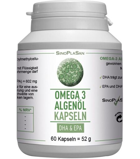 Nahrungsergänzungsmittel sind kein Ersatz für eine ausgewogene, abwechslungsreiche Ernährung und eine gesunde Lebensweise.Omega-3 Algenöl Kapseln mit DHA und EPAgewonnen aus der Mikroalge Schizochytrium sp.Dieses Produkt istVeganLaktosefreiGlutenfrei & hefefreiGelatinefreiSojafreiGMO-freiFrei von FarbstoffenFrei von AromastoffenZutaten:Algenöl, Kapselhülle Hydroxypropylmethylcellulose, KieselsäureNährwerte:Pro Tagesverzehr1 Kapsel% NRV*Algenöl720 mg-davon DHA417 mg-davon EPA150 mg-davon DOA35 mg-* % NRV = keine Daten vorhandenVerzehrempfehlung:1x täglich 1 Kapsel mit Flüssigkeit einnehmen.Die empfohlene tägliche Verzehrmenge darf nicht überschritten werden.Omega-3 pro Tagesverzehr (DHA+EPA+DPA) = 602 mgHinweis:Die angegebene empfohlene Tagesmenge darf nicht überschritten werden.Aufbewahrung: Kühl (6-25 °C) und lichtgeschützt lagern. Außerhalb der Reichweite von kleinen Kindern aufbewahren. Trocken und kühl lagernNettofüllmenge:60 Kapseln = 52 gHersteller:SinoPlaSan AGKrapfenreuter Str. 4D-73066 Uhingen ...