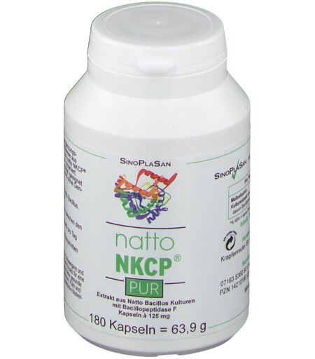 Nahrungsergänzungsmittel sind kein Ersatz für eine ausgewogene, abwechslungsreiche Ernährung und eine gesunde Lebensweise.natto NKCP® PUR Bacillopeptdase F Nahrungsergänzungsmittel (ohne Gentechnik).Zutaten:Maltodextrin, Kulturextrakt von Natto Bacillus, Kapselhülle HydroxypropylmethylcelluloseNährwerte:Inhaltsstoffe % NRV*Maltodextrin150 mg-Kulturextrakt von Natto Bacillus125 mg-davon Bacillopeptidase F4,6 U/g-* % NRV = keine Daten vorhandenVerzehrempfehlung:Zwischen den Mahlzeiten 2 Kapseln mit viel Flüssigkeit verzehren.Der Verzehr kann bei Bedarf auf 3 x2 Kapseln pro Tag erhöht werden.Hinweis:Die angegebene empfohlene tägliche Verzehrmenge darf nicht überschritten werden.Nahrungsergänzungsmittel für Erwachsene.Nicht für Schwangere und Stillende geeignet.Lagerung:Außerhalb der Reichweite von kleinen Kindern lagern.Nettofüllmenge:180 KapselnHersteller:SinoPlaSan AGKrapfenreuter Str. 4D-73066 Uhring ...
