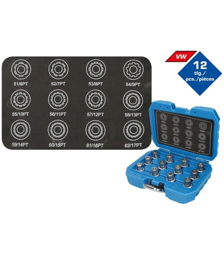 Brilliant Tools Felgenschloss-Sortiment für VW, 12-tlg Das BRILLIANT TOOLS Felgenschloss-Sortiment für VW BT691190 enthält 12 wesentliche Radmutter-Löseschlüssel zum beschädigungsfreien Öffnen von werksseitigen Felgenschlössern. Eigenschaften: 12-teiliges Sortiment Mit den Profilen 51/6PT, 52/7PT, 53/8PT, 54/9PT, 55/10PT, 56/11PT, 57/12PT, 58/13PT, 59/14PT, 60/15pt, 61/16PT, 62/17PT Geeignet für: verschiedene VW Modelle Anzahl Teile [tlg.]:12 -tlg. Gewicht [g]:790 g ...