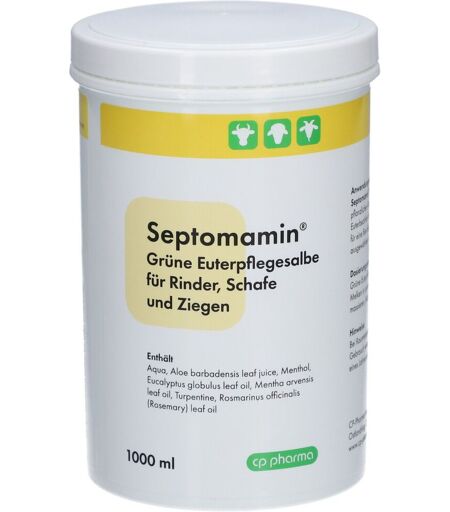 Septomamin – Grüne Euterpflegesalbe für Rinder, Schafe und Ziegen Septomamin ist eine spezielle Euterpflegesalbe, die durch ihre pflanzlichen Inhaltsstoffe aktivierend und kühlend auf die Euterbezirke wirkt. Aloe Vera unterstützt die Hautpflege und hilft, gereizte Haut zu beruhigen. Zusammensetzung: Aqua, Aloe barbadensis leaf juice, Menthol, Eucalyptus globulus leaf oil, Mentha arvensis leaf oil, Terpentine, Rosmarinus officinalis (Rosemary) leaf oil. Anwendungsgebiet: Zur Pflege und Beruhigung des Euters nach dem Melken. Dosierungsempfehlung: Nach dem Melken in ausreichender Menge auf das gereinigte Euter auftragen und gut einmassieren. Nicht auf Schleimhäute auftragen. Lagerung: Bei Raumtemperatur lagern, vor Frost und Hitze schützen. Nach Anbruch innerhalb eines Jahres aufbrauchen. Warnhinweise: Kann allergische Hautreaktionen verursachen. Schädlich für Wasserorganismen mit langfristiger Wirkung. Nach Gebrauch Hände gründlich waschen und Schutzkleidung tragen. Verpackungsgröße: 1000 ml Hersteller: CP-Pharma Handelsgesellschaft mbH, Ostlandring 13, 31303 Burgdorf ...