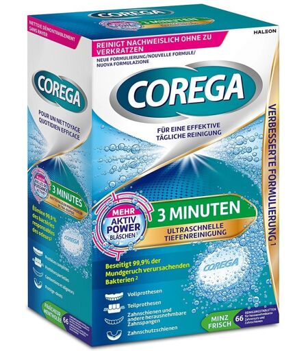 Anwendungsgebiet von Corega Tabs 3 Minuten Corega 3 Minuten Tabs für Voll- und Teilprothesen, Retainer und Aligner, Zahnschutzschienen und andere herausnehmbare ZahnspangenCorega Tabs 3 Minuten mit verbesserter Formulierung* bieten ultraschnelle Tiefenreinigung und sind geeignet für Voll- und Teilprothesen, Retainer und Aligner, Zahnschutzschienen und andere herausnehmbare Zahnspangen. Mit mehr Aktiv-Power-Bläschen*, die stark bei der Reinigung, aber sanft zum Zahnersatz und zu Zahnschienen sind. Corega 3 Minuten (Tabs): Eliminieren 99,9% der Mundgeruch verursachenden Bakterien**, für die effektive tägliche Entfernung von Verfärbungen und Ablagerungen*** und sorgen für Frische. Sie reinigen in nur 3 Minuten und sind für die tägliche Reinigung geeignet. Einfach anzuwenden - einweichen, abspülen, los! Zahnersatz unterscheidet sich von natürlichen Zähnen, weshalb er spezielle Pflege benötigt. Corega 3 Minuten (Tabs) beseitigen 99,9% der Mundgeruch verursachenden Bakterien** und dienen der effektiven täglichen Entfernung von Verfärbungen und Ablagerungen*** - für einen frischen und sauberen Zahnersatz. Im Gegensatz zu einigen Zahnpasten, bestehen Corega 3 Minuten (Tabs) aus nicht-abrasiven Inhaltsstoffen, so dass sie reinigen, ohne die Oberfläche zu zerkratzen. Dadurch bilden sich deutlich weniger Stellen, an denen sich Bakterien und andere unerwünschte Mikroorganismen ansiedeln können. Gut zu wissen: Da Zahnersatz etwa 10 mal weicher als natürliche Zähne ist, sollten Sie Ihre Prothese mit Corega 3 Minuten Tabs anstelle einer Zahnpasta reinigen. Herkömmliche Zahnpasta enthält Schleifstoffe, die die weichere Prothesenoberfläche zerkratzen können. In den Kratzern können Bakterien wachsen, die einen unangenehmen Geruch verursachen können. *gegenüber der vorherigen Formulierung**in Labortests getestet***bei täglicher Anwendung gemäß Gebrauchsanweisung Wirkstoffe / Inhaltsstoffe / ZutatenCorega Tabs 3 Minuten enthält: Sodi ...