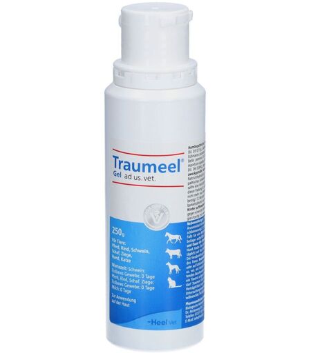 Traumeel® Gel ad us. vet. Gel Registriertes homöopathisches Arzneimittel - daher wird keine therapeutische Indikation angegeben. Wirkt gemäß Erfahrungen bei Hautverletzungen und Beschwerden des Stütz- und Bewegungsapparates, Muskelproblemen, Verrenkungen, Verstauchungen Inhaltsstoffe Beinwell Bergwohlverleih Eisenhut Gänseblümchen Gemenge, das im wesentlichen Mercuroamidonitrat enthält Johanniskraut Kalkschwefelleber Kamille Purpur-Sonnenhut Ringelblume Schafgarbe Schmalblättriger Sonnenhut Tollkirsche Zauberstrauch Anwendungsgebiet: Gel zur äußerlichen Anwendung für Tiere: Hund, Katze Dosierungsanleitung / Art und Dauer der Anwendung:Soweit nicht anders verordnet, wird das Gel bis zum Abklingen der krankhaften Erscheinungen 2-3 mal täglich auf der betroffenen Fläche der Haut einmassiert. Bei starker Schwellung wird das Gel messerrückendick aufgetragen und ggf. mit einem Verband abgedeckt. Zusammensetzung: 10 g enthalten: Arzneilich wirksame Bestandteile:Arnica montana D3 0,15 g, Calendula officinalis Ø 0,045 g, Hamamelis virginiana Ø 0,045 g, Echinacea Ø 0,015 g, Echinacea purpurea Ø 0,015 g, Matricaria recutita Ø 0,015 g, Symphy- tum officinale D4 0,01 g, Bellis perennis Ø 0,01 g, Hypericum perforatum D6 0,009 g, Achillea millefolium Ø 0,009 g, Aconitum napellus D1 0,005 g, Atropa bella-donna D1 0,005 g, Mercurius solubilis Hahnemanni D6 0,004 g. Sonstige Bestandteile:Carbopol 980 NF, gereinigtes Wasser, Natriumhydroxid 18 %-ig (Gew.-%), Ethanol 96 %. Wirkstoffe:Arnica montana, Achillea millefolium, Aconitum napellus, Atropa belladonna, Mercurius solubilis Hahnemanni, Hepar sulfuris, Calendula officinalis, Hamamelis virginiana, Echinacea, Echinacea purpurea, Chamomilla recutita, Symphytum, Bellis perennis, Hypericum perforatum ...