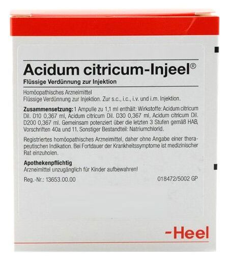 Homöopathisches ArzneimittelRegistriertes homöopathisches Arzneimittel, daher ohne Angabe einer therapeutischen Indikation. Bei Fortdauer der Krankheitssymptome ist medizinischer Rat einzuholen.Gegenanzeigen:Keine bekannt.Vorsichtsmaßnahmen für die Anwendung:Fragen Sie vor der Anwendung von allen Arzneimitteln in der Schwangerschaft und Stillzeit Ihren Arzt um Rat. Geben Sie Acidum citricum-Injeel Kindern unter 12 Jahren nur nach Rücksprache mit dem Arzt, da bisher keine ausreichenden Erfahrungen für eine allgemeine Empfehlung für diese Altersgruppe vorliegen.Wechselwirkungen:Keine bekannt.Allgemeiner Hinweis: Die Wirkung eines homöopathischen Arzneimittels kann durch allgemein schädigende Faktoren in der Lebensweise und durch Reiz- und Genussmittel ungünstig beeinflusst werden. Falls Sie sonstige Arzneimittel anwenden, fragen Sie Ihren Arzt.Dosierung und Art der Anwendung:Soweit nicht anders verordnet gilt für Erwachsene und Jugendliche ab 12 Jahren: Die Anwendung erfordert eine individuelle Dosierung durch einen homöopathisch erfahrenen Therapeuten.Im Rahmen der Selbstmedikation sollte daher parenteral nur einmal 1 Ampulle i.m., s.c., i.c., oder i.v. injiziert werden. Zur Fortsetzung der Therapie wird empfohlen, sich an einen homöopathisch erfahrenen Therapeuten zu wenden.Dauer der Behandlung:Auch homöopathische Arzneimittel sollten nicht über längere Zeit ohne ärztlichen Rat angewendet werden.Nebenwirkungen:Keine bekannt. Hinweis:Bei der Anwendung von homöopathischen Arzneimitteln können sich vorhandene Beschwerden vorübergehend verschlimmern (Erstverschlimmerung). In diesem Fall sollten Sie das Arzneimittel absetzen und Ihren Arzt befragen. Wenn Sie Nebenwirkungen bemerken, wenden Sie sich an Ihren Arzt oder Apotheker. Dies gilt auch für Nebenwirkungen, die nicht in dieser Packungsbeilage angegeben sind.Hinweise zu Verfallsdatum und Aufbewahrung:Arzneimittel unzugänglich für Kinder aufbewahren! Das Verfallsdatum dieser Packung ist auf Behältnis und äußere Umhüllung aufgedruckt. Verwenden Sie diese Packung nicht mehr nach diesem Datum! Für dieses Arzneimittel sind keine besonderen Lagerbedingungen erforderlich.Zusammensetzung:1 Ampulle zu 1,1 ml enthält: Wirkstoffe: Acidum citricum Dil. D10 0,367 ml Acidum citricum Dil. D30 0,367 ml Acidum citricum Dil. D200 0,367 mlGemeinsam potenziert über die letzten 3 Stufen gemäß HAB, Vorschriften 40a und 11. Sonstiger Bestandteil: Natriumchlorid. ...