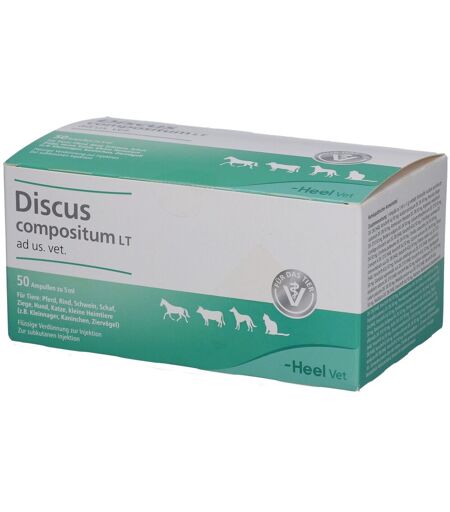 Anwendungsgebiete: Registriertes homöopathisches Arzneimittel, daher ohne Angabe einer therapeutischen Indikation. Vor der Anwendung sollte eine tierärztliche Untersuchung erfolgen.Gegenanzeigen: Nicht anwenden bei einer bekannten Überempfindlichkeit gegen einen der Inhaltsstoffe des Arzneimittels.Nebenwirkungen: Keine bekannt. Hinweis: Bei der Behandlung mit einem homöopathischen Arzneimittel können sich die vorhandenen Beschwerden vorübergehend verschlimmern (Erstverschlimmerung). In diesem Fall sollten Sie das Arzneimittel absetzen und Ihren Tierarzt befragen. Falls Sie eine Nebenwirkung bei Ihrem Tier/Ihren Tieren feststellen, die nicht in der Packungsbeilage aufgeführt ist, teilen Sie diese Ihrem Tierarzt oder Apotheker mit.Zieltierarten: Hund, Katze, kleine Heimtiere (z.B. Kleinnager, Kaninchen, Ziervögel)Dosierung, Art und Dauer der Anwendung: Zur subkutanen Injektion.Einzeldosis:Kleiner Hund, Katze: 1-2 mlKleine Heimtiere: 0,5 mlGroßer Hund: 3-4 ml Die Einzeldosis einmal täglich injizieren. Zur Langzeitbehandlung bei chronischen Erkrankungen oder bei Rezidivneigung die Einzeldosis jeweils in Abständen von 2 bis 4 Tagen injizieren. Das Präparat sollte ohne tierärztlichen Rat nicht über einen längeren Zeitraum angewendet werden.Besondere Lagerungshinweise: Arzneimittel unzugänglich für Kinder aufbewahren! Das Arzneimittel ist nach Ablauf des auf Behältnis und äußere Umhüllung angegebenen Verfalldatums nicht mehr anzuwenden. Nach Anbruch sofort verbrauchen. Angebrochene Ampullen sind zu verwerfen. Für dieses Arzneimittel sind keine besonderen Lagerbedingungen erforderlich.Besondere Vorsichtsmaßnahmen für die Anwendung: Bei Überempfindlichkeit gegen Korbblüter sollte Discus compositumLT ad us. vet. mit Vorsicht eingesetzt werden. Bei anhaltenden, unklaren, periodisch oder neu auftretenden Beschwerden,Fieber oder schwere Störungen des Allgemeinbefindens sollte umgehend ein Tierarzt aufgesucht werden. Eine Injektiondieses Arzneimittels sollte nur von Tierärzten oder anderen Personen durchgeführt werden, die die jeweilige Injektionstechniksicher beherrschen.Anwendung während der Trächtigkeit und Laktation oder der Legeperiode: Wie alle Arzneimittel sollten auch homöopathische Arzneimittel während der Trächtigkeit und Laktation sowie in der Legeperiode nur nach Rücksprache mitdem Tierarzt angewendet werden.Wechselwirkungen: Wie bei allen Arzneimitteln können auch bei homöopathischen Arzneimitteln Wechselwirkungen mit anderen Arzneimitteln auftreten. Wenn Discus compositum LT ad us. vet. gleichzeitig mit einem anderen Arzneimittel angewendet werden soll, fragen Sie dazu Ihren Tierarzt.Zusammensetzung: 1 Ampulle zu 5 ml (= 5 g) enthält: Wirkstoffe: Acidum ascorbicum Dil. D6 (HAB, Vorschrift 5a) 50 mg, Acidum picrinicum Dil. D6 50 mg, Aesculus hippocastanum Dil. D6 50 mg, Ammonium chloratum Dil. D8 50 mg, Argentum metallicum Dil. D10 50 mg, Berberis vulgaris Dil. D4 50 mg, Calcium phosphoricum Dil. D10 50 mg, Cartilago articularis suis... ...