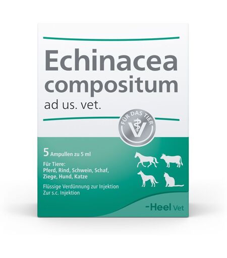 Flüssige Verdünnung zur InjektionHomöopathisches ArzneimittelAnwendungsgebiete:Registriertes homöopathisches Arzneimittel, daher ohne Angabe einer therapeutischen Indikation. Vor der Anwendung sollte eine tierärztliche Untersuchung erfolgen. Dosierung und Art der Anwendung:Soweit nicht anders verordnet, Echinacea compositum ad us. vet. subkutan injizieren. Entsprechend der Tierart beträgt die Einzeldosis pro Tag: Großer Hund: 3-4 ml Mittlerer Hund: 2 ml Kleiner Hund, Katze: 1-2 ml Welpen: 0,5-1 ml Bei akuten Beschwerden kann die angeführte Dosis nach 24 Stunden wiederholt werden.Dauer der Behandlung:Hinweis: Das Präparat sollte ohne tierärztlichen Rat nicht über einen längeren Zeitraum angewendet werden. ...