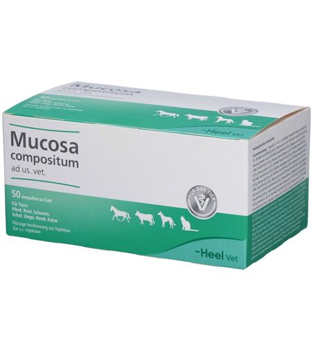 Flüssige Verdünnung zur Injektion Homöopathisches Arzneimittel Registriertes homöopathisches Arzneimittel, daher ohne Angabe einer therapeutischen Indikation. Vor der Anwendung sollte eine tierärztliche Untersuchung erfolgen. Gegenanzeigen: Nicht anwenden bei einer bekannten Überempfindlichkeit gegen einen der Inhaltsstoffe des Arzneimittels.Wechselwirkungen: Keine bekannt. Wie bei allen Arzneimitteln können auch bei homöopathischen Arzneimitteln Wechselwirkungen mit anderen Arzneimitteln auftreten. Wenn Mucosa compositum ad us. vet. gleichzeitig mit einem anderen Arzneimittel angewendet werden soll, fragen Sie dazu Ihren Tierarzt.Nebenwirkungen: Keine bekannt. Hinweis: Bei der Behandlung mit einem homöopathischen Arzneimittel können sich die vorhandenen Beschwerden vorübergehend verschlimmern (Erstverschlimmerung). In diesem Fall sollten Sie das Arzneimittel absetzen und Ihren Tierarzt befragen. Falls Sie eine Nebenwirkung bei Ihrem Tier / Ihren Tieren feststellen, die nicht in der Packungsbeilage aufgeführt ist, teilen Sie diese Ihrem Tierarzt oder Apotheker mit.Zieltierarten: Hund, Katze.Dosierung und Art der Anwendung: Soweit nicht anders verordnet, Mucosa compositum ad us. vet. subkutan injizieren. Entsprechend der Tierart beträgt die Einzeldosis pro Tag: Großer Hund 3-4 ml 3-4 ml Mittlerer Hund 2 ml Kleiner Hund, Katze 1-2 ml Welpen 0,5-1 ml Bei akuten Beschwerden die angeführte Dosis nach 24 Stunden wiederholen. Bei Rezidivneigung, chronischen Erkrankungen oder zur Langzeitbehandlung wird die Einzeldosis jeweils im Abstand von 4 Tagen verabreicht.Dauer der Behandlung: Hinweis: Das Präparat sollte ohne tierärztlichen Rat nicht über einen längeren Zeitraum angewendet werden.Vorsichtsmaßnahmen für die Anwendung: Bei anhaltenden, unklaren, perio disch oder neu auftretenden Beschwerden, Fieber oder schweren Störungen des Allgemeinbefindens sollte umgehend ein Tierarzt aufgesucht werden. Eine Injektion dieses Arzneimittels sollte nur von Tierärzten oder anderen Personen durchgeführt werden, die die jeweilige Injektionstechnik sicher beherrschen. Wie alle Arzneimittel sollten auch homöopathische Arzneimittel während der Trächtigkeit und Laktation nur nach Rücksprache mit dem Tierarzt angewendet werden.Warnhinweise: Keine.Hinweise zu Verfallsdatum und Aufbewahrung: Arzneimittel unzugänglich für Kinder aufbewahren! Das Arzneimittel ist nach Ablauf des auf Behältnis und äußerer Umhüllung angegebenen Verfalldatums nicht mehr anzuwenden.Lagerungshinweis: Für dieses Arzneimittel sind keine besonderen Lagerhinweise erforderlich. Nach Anbruch sofort verbrauchen. Angebrochene Ampullen sind zu verwerfen.Zusammensetzung: 1 Ampulle zu 5 ml (= 5 g) enthält: Wirkstoffe: Mucosa nasalis suis Dil. D8 (HAB, Vorschrift 42a) 0,05 g, Mucosa oris suis Dil. D8 (HAB, Vorschrift 42a) 0,05 g, Mucosa pulmonis suis Dil. D8 (HAB, Vorschrift 42a) 0,05 g, Mucosa oculi suis Dil. D8 (HAB, Vorschrift 42a) 0,05 g, Mucosa vesicae felleae suis... ...