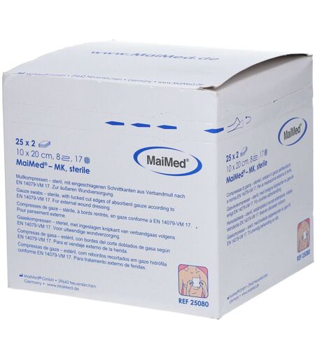 MaiMed® - MK steril Gebrauchsfertige Mullkompressen Extraweicher Verbandmull, 17-fädig DIN EN 14079-VM 17 In verschiedenen Lagen erhältlich 100 % Baumwolle ES = eingeschlagene Schnittkanten Anwendung Zur äußeren Wundversorgung bei sezernierenden und verunreinigten Wunden, Blutabsorption und Sekretaufnahme im Ambulanzbereich, auf der Station und im Erste-Hilfe-Bereich. ...