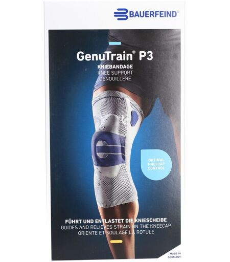 GenuTrain® Kniebandage rechts Gr.6 Natur Reduktion der Knieschmerzen durch Kompression und Omega+ Pad mit Meniskusflügeln Train-Gestrick entlastet und stabilisiert dein Knie über neuromuskuläre Prozesse Inklusive Therapie-App für dein individuelles Bewegungstraining Digital vermessbar mit Bodytronic-Messtechnologie Nach akuter Verletzung oder Operation, bei chronischen Veränderungen, Arthrose oder Instabilität im Knie: Die Kniebandage GenuTrain wirkt schmerzlindernd und unterstützt dich bei der Mobilisierung. Schritt für Schritt kannst du deine natürlichen Bewegungsabläufe verbessern und dein Knie stabilisieren. Das ermöglicht eine frühzeitige Aufnahme von Physiotherapie und behutsamem Training. Die GenuTrain Kniebandage gibt deinem Knie mehr Sicherheit für heilungsfördernde Bewegung. Sie lindert deine Knieschmerzen, fördert die Beweglichkeit durch eine Wechseldruckmassage und die Stimulation bestimmter Schmerzpunkte. Dabei aktiviert sie die stabilisierende Beinmuskulatur und verbessert die Koordination. Gleichzeitig fördert die GenuTrain Bandage die Durchblutung und den Abbau von Schwellungen für einen zügigen Heilungsverlauf deiner Kniebeschwerden. Eine ringförmige Pelotte, das Omega+ Pad, sorgt in Verbindung mit dem Train-Gestrick für Druckentlastung. Integrierte Druckpunkte der Pelotte wirken mit ihren speziell beweglichen Massagenoppen lindernd auf besonders schmerzhafte Bereiche. An den Seiten der Kniegelenkbandage sorgen zwei flexible Kunststoffstäbe dafür, dass die GenuTrain stets perfekt sitzt und in der Bewegung nicht verrutscht. Oben und unten erleichtern eingearbeitete Griffe das An- und Ablegen der Bandage. Das anatomisch geformte, atmungsaktive und hautfreundliche Train-Gestrick bietet einen hohen Tragekomfort. Indikationen: Tendopathie, Tendomyopathie, Ansatzligamentose, Meniskopathie, chronische, posttraumatische oder postoperative Reizzustände rezidivierender Gelenkerguss Gonarthrose / Arthritis (Gelenkverschleiß / Gelenkentzündung) Prävention / Rezidivprophylaxe Instabilitätsgefühl Pflegehinweis: Die GenuTrain ist bei 30° C in der Waschmaschine waschbar. Bitte verwende Feinwaschmittel und ein Wäschenetz. Setze dein Produkt nie direkter Hitze / Kälte aus. Beachte auch die Hinweise auf dem Einnähetikett am oberen Rand deines Produktes. Regelmäßige Pflege gewährleistet eine optimale Wirkung. ...