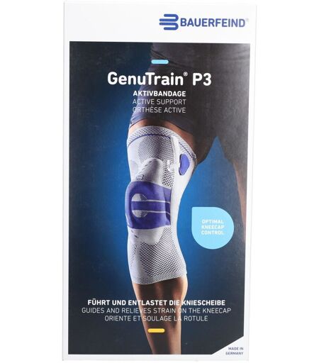 GenuTrain® Kniebandage links Gr.2 Natur Reduktion der Knieschmerzen durch Kompression und Omega+ Pad mit Meniskusflügeln Train-Gestrick entlastet und stabilisiert dein Knie über neuromuskuläre Prozesse Inklusive Therapie-App für dein individuelles Bewegungstraining Digital vermessbar mit Bodytronic-Messtechnologie Nach akuter Verletzung oder Operation, bei chronischen Veränderungen, Arthrose oder Instabilität im Knie: Die Kniebandage GenuTrain wirkt schmerzlindernd und unterstützt dich bei der Mobilisierung. Schritt für Schritt kannst du deine natürlichen Bewegungsabläufe verbessern und dein Knie stabilisieren. Das ermöglicht eine frühzeitige Aufnahme von Physiotherapie und behutsamem Training. Die GenuTrain Kniebandage gibt deinem Knie mehr Sicherheit für heilungsfördernde Bewegung. Sie lindert deine Knieschmerzen, fördert die Beweglichkeit durch eine Wechseldruckmassage und die Stimulation bestimmter Schmerzpunkte. Dabei aktiviert sie die stabilisierende Beinmuskulatur und verbessert die Koordination. Gleichzeitig fördert die GenuTrain Bandage die Durchblutung und den Abbau von Schwellungen für einen zügigen Heilungsverlauf deiner Kniebeschwerden. Eine ringförmige Pelotte, das Omega+ Pad, sorgt in Verbindung mit dem Train-Gestrick für Druckentlastung. Integrierte Druckpunkte der Pelotte wirken mit ihren speziell beweglichen Massagenoppen lindernd auf besonders schmerzhafte Bereiche. An den Seiten der Kniegelenkbandage sorgen zwei flexible Kunststoffstäbe dafür, dass die GenuTrain stets perfekt sitzt und in der Bewegung nicht verrutscht. Oben und unten erleichtern eingearbeitete Griffe das An- und Ablegen der Bandage. Das anatomisch geformte, atmungsaktive und hautfreundliche Train-Gestrick bietet einen hohen Tragekomfort. Indikationen: Tendopathie, Tendomyopathie, Ansatzligamentose, Meniskopathie, chronische, posttraumatische oder postoperative Reizzustände rezidivierender Gelenkerguss Gonarthrose / Arthritis (Gelenkverschleiß / Gelenkentzündung) Prävention / Rezidivprophylaxe Instabilitätsgefühl Pflegehinweis: Die GenuTrain ist bei 30° C in der Waschmaschine waschbar. Bitte verwende Feinwaschmittel und ein Wäschenetz. Setze dein Produkt nie direkter Hitze / Kälte aus. Beachte auch die Hinweise auf dem Einnähetikett am oberen Rand deines Produktes. Regelmäßige Pflege gewährleistet eine optimale Wirkung. ...