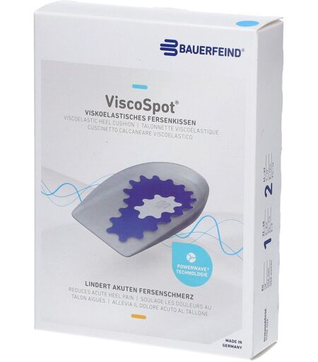 Unbenanntes Dokument Viscospot Fersenkissen Gr. 1 rechts ViscoSpot kann deine Fersenschmerzen lindern, indem sie den Druck mit drei unterschiedlich harten Wirkzonen optimal verteilt: Der besonders weiche weiße Bereich polstert gezielt den Schmerzpunkt ab. Die etwas festere blaue Zone entlastet Sehnen und Ansatzstellen. Am stabilsten ist der graue Rand. Er führt den Fuß und gibt Halt beim Auftreten. lindert punktuellen Fersenschmerz besonders bei Fersensporn geeignet verschiedene Zonen verteilen den schmerzauslösenden Druck Stoßdämpfer für empfindliche Fersen Die Ferse trägt den Druck unseres vollen Körpergewichts. Kein Wunder, dass viele Menschen bei jedem Schritt dort äußerst unangenehme Schmerzen haben. ViscoSpot entlastet gezielt den schmerzenden Bereich deiner Ferse. Bei jedem Schritt wirkt sie wie ein Stoßdämpfer. Drei unterschiedlich harte Wirkzonen führen zu einer optimalen Umverteilung des Drucks: Der weiße Bereich in der Mitte ist besonders weich, um genau den Schmerzpunkt abzupolstern. Die blaue Zone ist etwas fester und entlastet Sehnen und Ansatzstellen. Der ausreichend stabile graue Rand führt den Fuß und gibt Halt. Die Übergänge zwischen den Zonen sind dank der patentierten wellenförmigen Verbindung fließend und für die Ferse nicht spürbar. Auch der Kantendruck wird dadurch reduziert. Komfortabel und leicht zu reinigen ViscoSpot ist der Form der Ferse nachempfunden. In geschlossenen Schuhen bettet es deine Ferse sanft und passgenau. Das Fersenkissen ist aus qualitativ hochwertigem Silikon gefertigt. Dadurch ist es hautfreundlich, leicht zu reinigen und dank moderner Fertigungstechnik besonders haltbar. Es sitzt rutschfest in fast jedem Schuhwerk, egal ob für Freizeit, Sport oder Arbeit. Du erhältst ViscoSpot als Set für beide Füße oder einzeln mit einem Ausgleichskissen für den anderen Fuß Größe Schuhgröße 1 32-40 2 41-47 Pflegehinweise Wir empfehlen, das ViscoSpot Fersenkissen mit einem Feinwaschmittel abzuwaschen. Nettofüllmenge: 1 Stück (Größe 1, rechts) Herstellerdaten: Bauerfeind AG ...