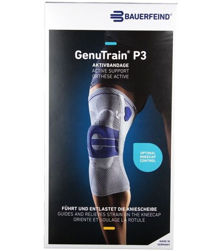 Unbenanntes Dokument Genutrain Knieband sicherer Halt für das Kniegelenk Entlastung der Kniescheibe Schmerzreduktion am Meniskus anatomische Passform integrierte Anziehhilfe Größe: 2 / rechts / titan Nettofüllmenge: 1 Stück Herstellerdaten: Bauerfeind AG ...