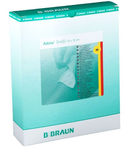 Askina® DresSil Der silikonbeschichtete Schaumstoffverband Atmungsaktiver, hochabsorbierender und silikonbeschichteter Polyurethanschaum für ein sehr gutes Exsudatmanagement und atraumatische Verbandwechsel Eigenschaften Haftet sanft und sicher - auch über mehrere Tage Atraumatischer und schmerzarmer Verbandwechsel Keine Störung der Wundheilung durch Schädigung von Granulations- und Epithelgewebe Hinterlässt keine Verbandrückstände auf der Wunde Minimiert das Risiko von allergischen Reaktionen Unterstützt ein feuchtes Wundmilieu Minimiert das Mazerationsriskio der Wundumgebung Indikationen: Dekubitus, Ulcus cruris, Diabetisches Fußulcus, traumatische Wunden, chirurgische Wunden, palliative Wunden ...