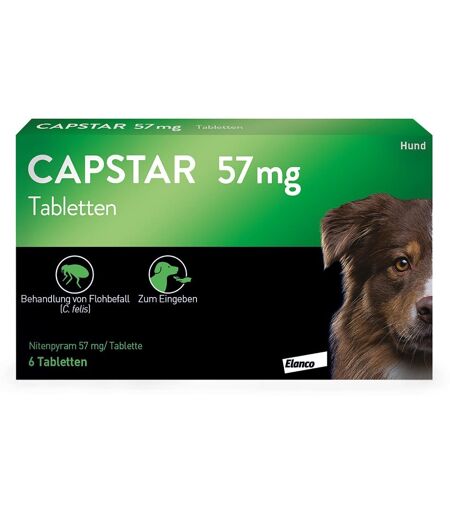 Anwendungsgebiet von Capstar Tabletten gegen Flöhe für Hunde von 11 bis 57 kg Capstar Tabletten für große Hunde bis 57 kg – die schnelle Hilfe bei FlohbefallFlöhe gehören zu den häufigsten und hartnäckigsten Parasiten bei Hunden und Katzen. Viele Tiere werden mindestens einmal in Ihrem Leben von diesen lästigen Insekten befallen – meistens durch Kontakt mit anderen befallenen Tieren. Das Tückische: Flöhe vermehren sich bei optimalen Bedingungen besonders rasch und so kann nach kurzer Zeit eine richtige Flohplage entstehen. Ist ein Floh auf dem Tier entdeckt, ist das meistens nur die Spitze des Eisberges, denn nach der Blutmahlzeit beginnen Flöhe mit der Eiablage. Die Eier und daraus schlüpfenden Larven befinden sich dann in der Umgebung des Tieres: im Körbchen, unter Möbeln oder im Teppich.Capstar Tabletten für große Hunde mit dem Wirkstoff Nitenpyram wirken direkt und schnell gegen erwachsene Flöhe bei Hunden. Der rasche Wirkeintritt beginnt bereits 15 bis 30 Minuten nach Gabe und sorgt dafür, dass die auf dem Hund befindlichen Flöhe abgetötet werden. Nach 6 Stunden sind nahezu alle Flöhe auf dem Hund abgetötet. Dadurch kann verhindert werden, dass erwachsene Flöhe Blut saugen und Eier legen können, die sich dann in der weiteren Umgebung verteilen. Dabei ist Capstar in der Anwendung besonders einfach: Nur eine Tablette reicht zur Behandlung eines akuten Flohbefalls eines großen Hundes von 11 kg bis 57 kg aus.Capstar ist gut verträglich und kann auch an säugende Hündinnen gefüttert werden. Auch Welpen ab einem Alter von 4 Wochen und 11 kg Körpergewicht können so von lästigem Flohbefall befreit werden. Für wen ist Capstar das richtige Produkt?• wenn Sie Flöhe an Ihrem Tier entdeckt haben und rasch handeln wollen, bevor Sie ein Langzeit-Präparat anwenden• wenn Sie Ihr Tier aus einer Hundepension/Ferienbetreuung abholen und sichergehen wollen, sich keine Flöhe mit nach Hause zu nehmen• wenn für Sie eine ...