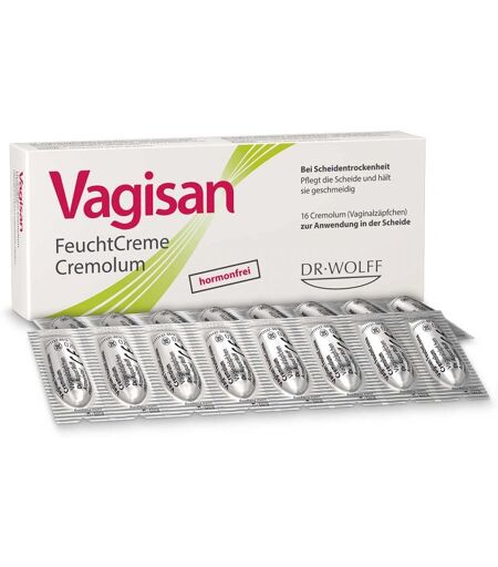 Anwendungsgebiet von Vagisan Feuchtcreme CremolumVagisan Feuchtcreme Cremolum sind weichschmelzende Vaginalzäpfchen gegen Scheidentrockenheit und für Frauen, die ein Brennen oder Jucken in der Scheide verspüren. Sie bietet sich vor allem an, wenn ein Applikator als unangenehm empfunden wird. Die weichschmelzenden Zäpfchen pflegen außerdem die Scheide, sind einfach in der Anwendung und dadurch besonders bequem auch für unterwegs. Scheidentrockenheit betrifft vor allem Frauen in bzw. nach den Wechseljahren, aber auch bereits jüngere Frauen können von einer trockenen Scheide betroffen sein. Ein Östrogenmangel (in der Menopause und danach) sind häufig der Grund dafür, aber auch Hormonschwankungen oder Stress können eine Ursache sein. Scheidentrockenheit macht sich oftmals durch Schmerzen beim Sex bemerkbar, kann die betroffenen Frauen aber auch in alltäglichen Situationen beeinträchtigen, z. B. beim Sitzen oder Fahrradfahren. Eine regelmäßige Anwendung von Vagisan Feuchtcreme Cremolum kann dazu beitragen, durch vaginale Trockenheit bedingte Reizungen, Entzündungen und Schmerzen in der Scheide vorzubeugen. Vagisan Feuchtcreme Cremolum macht die empfindliche Haut in der Scheide angenehm geschmeidig. Das kann sich auch positiv beim Sex auswirken, insbesondere für Frauen, die ansonsten zu Schmerzen beim Sex durch eine trockene Scheide neigen.Wirkungsweise von Vagisan Feuchtcreme CremolumDie weichschmelzenden Zäpfchen von Vagisan Feuchtcreme Cremolum versorgen eine trockene Vagina mit Lipiden. Die durch Scheidentrockenheit hervorgerufenen Symptome, wie z. B. Trockenheitsgefühl, Brennen, Juckreiz oder Scheidenschmerzen werden gelindert. Durch die Wärme der Scheide schmelzen die Zäpfchen und bilden zusammen mit der Scheidenflüssigkeit eine Creme, die das Innere der Scheide pflegt und geschmeidig macht.Wirkstoffe / Inhaltsstoffe / ZutatenInhaltsstoffe von Vagisan Feuchtcreme Cremolum: Calcium Lactate, Cetearyl Al ...