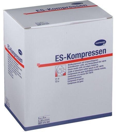 ES-Kompressen 5 x 5cm steril Größe Wundauflage 5 x 5cm Zur allgemeinen Wundversorgung, insbesondere zur Erstversorgung von verschmutzten, infizierten und stark sezernierenden Wunden, als Tupfer und als Kompressen bei kleineren operativen Eingriffen in der Ambulanz und auf der Station. sterile, weiche, saugfähige Mullkompresse allgemeine Wundversorgung und zur Erstversorgung bei kleineren Eingriffen Anwendung Zur allgemeinen Wundversorgung, insbesondere zur Erstversorgung von verschmutzten, infizierten und stark sezernierenden Wunden; als Tupfer und als Kompressen bei kleineren operativen Eingriffen. ...