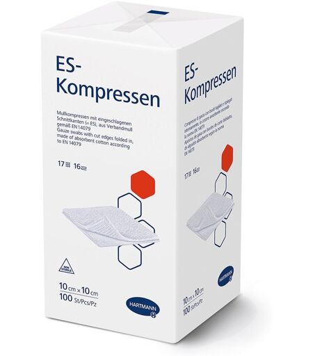 ES-Kompressen unsteril 16fach 10 x 10 cm Größe Wundauflage 10 x 10 cm HARTMANN ES-Kompressen sind der Klassiker unter den Mullkompressen. Die eingeschlagenen Schnittkanten verhindern das Risiko, dass störende Randfäden sich ablösen und in die Wunde gelangen. Die Kompresse ist mehrfach aufklappbar. So besteht die Möglichkeit verschieden große Körperstellen vollständig abzudecken. Zudem kann die ES-Kompresse neben der allgemeinen Funktion der Wundabdeckung auch als Trägermaterial für Salbe dienen, oder eine polsternde Funktion im Rahmen der Wundversorgung einnehmen. Weich und anschmiegsam: für ein angenehmes Gefühl auf der Haut Vielseitig: Zum Reinigen, Abdecken und Polstern geeignet Eingeschlagene Schnittkanten (ES): Diese verhindern das Ablösen störender Randfäden ...