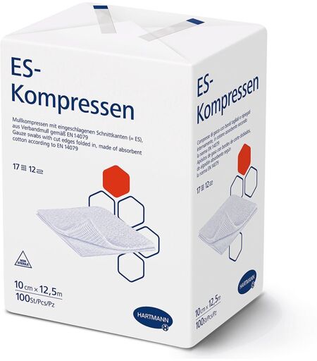 ES-Kompressen unsteril 12fach 10 x 12,5 cm Größe Wundauflage 10 x 12,5 cm HARTMANN ES-Kompressen sind der Klassiker unter den Mullkompressen. Die eingeschlagenen Schnittkanten verhindern das Risiko, dass störende Randfäden sich ablösen und in die Wunde gelangen. Die Kompresse ist mehrfach aufklappbar. So besteht die Möglichkeit verschieden große Körperstellen vollständig abzudecken. Zudem kann die ES-Kompresse neben der allgemeinen Funktion der Wundabdeckung auch als Trägermaterial für Salbe dienen, oder eine polsternde Funktion im Rahmen der Wundversorgung einnehmen. Weich und anschmiegsam: für ein angenehmes Gefühl auf der Haut Vielseitig: Zum Reinigen, Abdecken und Polstern geeignet Eingeschlagene Schnittkanten (ES): Diese verhindern das Ablösen störender Randfäden ...