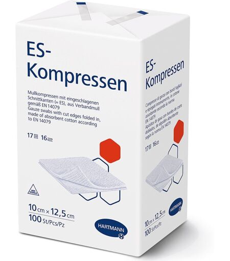 ES-Kompressen unsteril 16fach 10 x 12,5 cm Größe Wundauflage 10 x 12,5 cm HARTMANN ES-Kompressen sind der Klassiker unter den Mullkompressen. Die eingeschlagenen Schnittkanten verhindern das Risiko, dass störende Randfäden sich ablösen und in die Wunde gelangen. Die Kompresse ist mehrfach aufklappbar. So besteht die Möglichkeit verschieden große Körperstellen vollständig abzudecken. Zudem kann die ES-Kompresse neben der allgemeinen Funktion der Wundabdeckung auch als Trägermaterial für Salbe dienen, oder eine polsternde Funktion im Rahmen der Wundversorgung einnehmen. Weich und anschmiegsam: für ein angenehmes Gefühl auf der Haut Vielseitig: Zum Reinigen, Abdecken und Polstern geeignet Eingeschlagene Schnittkanten (ES): Diese verhindern das Ablösen störender Randfäden ...