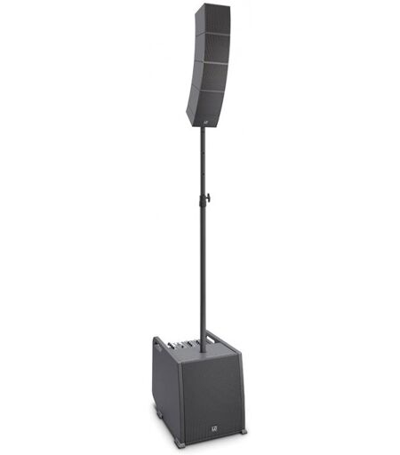 Portables Array System Entertainer Set inklusive Distanzstange und Lautsprecherkabel: Das erste transportfreundliche Array-System, Flexible Konfigurationsmöglichkeiten, WaveAhead®-Technik für höchste Audio-Qualität, SmartLink®-Adapter für universelle Montage, Integrierter 4-Kanal-Mixer mit DFX und Bluetooth®, Leichte Unibody-Array-Elemente aus robustem Aluminium, Für mobilen Einsatz und Festinstallationen, Das CURV 500® Entertainer Set besteht aus einem leistungsstarken 10“ Bassreflex Subwoofer und dem leicht konfigurierbaren Array-System mit vier Satelliten. Mit 460 Watt RMS-Leistung und einem maximalen Schalldruck von 128 dB lassen sich kleinere Veranstaltungen oder Konferenzen und Tagungen gut beschallen. Das kompakte, besonders transportfreundliche CURV 500® ist ein Array-System mit vier ineinander verriegelnden Satelliten, die an einem SmartLink®-Adapter betrieben werden. Die nur 12 x 12 cm großen Elemente sind mit LD Systems eigener WaveAhead®- Technologie ausgestattet. Ein 4" und drei 1" Treiber sorgen jeweils für eine kohärente und extrem detaillierte Wiedergabe mit hohem Druck und Dynamik. Der 10" Bassreflex-Subwoofer beherbergt die Class-D-Verstärkung mit Limiter, Schutz gegen Kurzschluss, Überhitzung und Überspannung sowie einen 4-Kanal-Mixer mit 16 digitalen Effekt-Presets und Bluetooth®. Combo- und speakON-kompatible Buchsen bieten umfangreiche Anschlussmöglichkeiten, dazu besitzt der Subwoofer vier digitale System-Presets, einen M20-Gewindeflansch und drei ergonomische Tragegriffe. Das Entertainer-Set lässt sich in Stereo-Anwendung mit insgesamt acht Array-Satelliten betreiben (max. vier je Seite). Diese Variante ist besonders bei Sprachanwendungen von großem Nutzen, wo die Basswiedergabe nicht im Vordergrund steht. Klarheit, Transparenz und die für Array-Systeme typischen Vorteile wissen Redner oder Moderatoren besonders zu schätzen. Mit dem Power Extension Set lässt sich das Entertainer Set für noch mehr Leistung gerade im Bassbereich jederzeit zum kraftvollen Power Set ausbauen. Zum CURV 500® Entertainer Set gehören neben Subwoofer mit Mixereinheit und vier Satelliten auch SmartLink®-Adapter, Distanzstange und Lautsprecherkabel. Technische Daten: Produktart: PA Komplettsysteme, Systemleistung (RMS): 460 W, Farbe: schwarz, Anzahl Array-Satelliten: 4, Anzahl Smartlink-Adapter: 1, Anzahl Subwoofer: 1, Max. SPL (kontinuierlich): 122 dB, Max. SPL (Peak): 128 dB, Frequenzgang: 47 - 20000 Hz, Abstrahlwinkel (H x V): 110° horizontal, vertikal (je Satellit) 10 °, Leistung (RMS): Subwoofer: 300 W, Array-Satelliten: 2 x 160 W, Leistung (Peak): Subwoofer: 1200 W, Array-Satelliten: 2 x 640 W, Verstärker: Class D, Schutzschaltungen: DSP basierter Multiband Limiter, Schutzschaltungen: Kurzschluss, Schutzschaltungen: Überhitzung, Schutzschaltungen: Überlastung, Gewicht: 26,8 kg, Zubehör (im Lieferumfang): Distanzstange, Zubehör (im Lieferumfang): Lautsprecherkabel CURV 500 CABLE 1 (2,2 m), Zubehör (im Lieferumfang): Netzkabel, Subwoofer Größe... ...