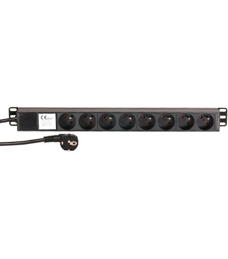 19" 1HE Steckdosenleiste 8-fach, französische Norm: Stromverteiler 19"/1 HE, Zweipoliger beleuchteter Schalter vorderseitig, 8 französische Steckplätze rückseitig, Einbautiefe: 54 mm, Kabelzuführung seitlich, Transparenter Schrumpfschlauch zum Beschriften von Kabeln, Technische Daten: Produktart: 19" Rack Steckdosenleisten, Bauform: 19" / 1 HE, Anzahl Steckdosen (Schutzkontakt / CEE 7/5): 45° gedreht, Anzahl Steckdosen (Schutzkontakt / CEE 7/5): 8, Stromzuführung: Kabel mit Schutzkontaktstecker CEE 7/7, Kabellänge: 2 m, Länge Schrumpfschlauch: 60 mm, Betriebsspannung: 250 V, Max. Stromstärke: 16 A, Gehäusematerial: Aluminium, Farbe: schwarz, Farbe Schrumpfschlauch: transparent, Breite: 485 mm, Höhe: 44 mm, Tiefe: 44 mm, Gewicht: 1 kg ...