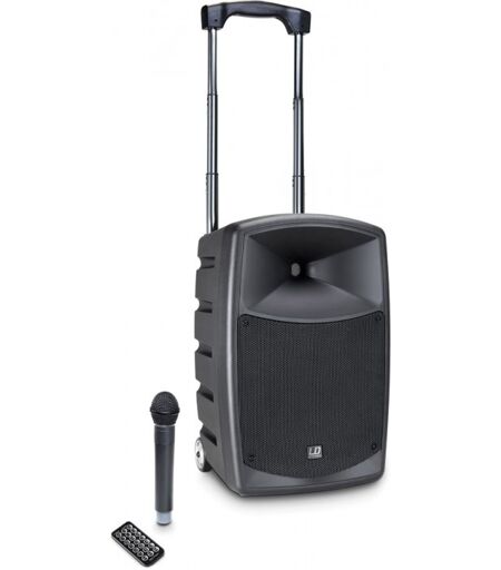 Akkubetriebener Bluetooth-Lautsprecher mit Mixer und Funkmikrofon: Akkubetriebene Lautsprecher-Komplettlösung, Integrierter Funkempfänger 655 – 679 MHz, Bluetooth-Player mit USB-Port und SD-Kartenschacht, Class D Endstufe mit 480 Watt Spitzenleistung, 2 Combobuchsen als Mikrofon- oder Line-Eingänge, 3,5 mm Aux-Eingang, Master-Sektion mit 2-Band-EQ, Integrierte Rollen, Ausziehgriff und 35 mm Stativaufnahme, Inklusive Funkmikrofon und IR-Fernbedienung, Der LD Systems Roadbuddy 10 ist die ideale Lösung zur Sprach- und Musikübertragung unterwegs. Der 2-Wege-Lautsprecher mit einem 10" Custom-Woofer und 1" Kompressionstreiber ist mit seinem wiederaufladbaren Akku bis 8 Stunden betriebsfähig und wird von einer Class D Endstufe mit hocheffizientem Schaltnetzteil und 480 Watt Spitzenleistung angetrieben. Der Roadbuddy setzt voll und ganz auf drahtlose Übertragung: er besitzt einen UHF-Funkempfänger, der mit 655 – 679 MHz-Bereich arbeitet, und ist um ein zusätzliches System erweiterbar. Der bordeigene Bluetooth-Player mit hinterleuchtetem Multifunktions-Display, Equalizer, USB-Port und SD-Kartenschacht unterstützt die Formate .mp3, .WMA und .WAV. Ein Handmikrofon mit 10 mW Sendeleistung (LDRBUD10B6) oder alternativ ein Headset mit Beltpack (LDRBUD10HSB6) und die IR-Fernbedienung des Players gehören zum Lieferumfang. Für kabelgebundene Geräte besitzt der Roadbuddy zwei Kanäle mit Combo-Buchsen und individuellen Lautstärkereglern, die für Mikrofon- und Line-Pegel schaltbar sind, einen Stereoeingang über RCA (Cinch) –Buchsen (Monosummiert) und einen 3,5 mm Aux- Eingang. Regler für Höhen, Tiefen, Echo und ein Mastervolumen vervollständigen das Bedienfeld. Der LD Systems Roadbuddy ist durch integrierte Rollen und einen Ausziehgriff bequem transportierbar. Auf der Oberseite befindet sich ein praktisches Staufach für bis zu zwei Handsender-Mikrofone. In das Kunststoffgehäuse des ausgesprochenen Leichtgewichts ist eine 35 mm Stativaufnahme eingelassen. Technische Daten: Produktart: Akkubetriebene PA Lautsprecher, Größe Tieftöner: 10 ", Größe Tieftöner: 254 mm, Magnet Tieftöner: Ferrit, Marke Tieftöner: Custom Made, Größe HF Treiber: 1 ", Größe HF Treiber: 25,4 mm, Magnet HF Treiber: Ferrit, Marke HF Treiber: Custom Made, Verstärker: Class D, Leistung (RMS): 120 W, Leistung (Peak): 480 W, Frequenzgang: 55 - 18000 Hz, SPL (1 W/1 m): 96 dB, Max. SPL: 115 dB, Schutzschaltungen: Kurzschluss, Schutzschaltungen: Überladungsschutz, Schutzschaltungen: Überspannung, Bedienelemente: AUX / MP3 Schalter, Bedienelemente: CD / Tape IN Level, Bedienelemente: Echo, Bedienelemente: Gesamtlautstärke, Bedienelemente: High, Bedienelemente: Low, Bedienelemente: Mic 1 Level, Bedienelemente: Mic 2 Level, Anzeigeelemente: Lade- / Batteriestatus, Anzeigeelemente: Power, Media Player unterstützte Medien: Bluetooth, unterstützte Medien: SD Card, unterstützte Medien: USB-Stick, unterstützte Formate: MP3-Datei, unterstützte Formate: WAV-Datei, unterstützte Formate: WMA-Datei, Bedienelemente... ...