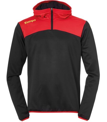 Kempa Emotion 2.0 Quarter Zip Hoody Kinder schwarz/rot Details schnitttechnisches Design vorne und hinten 1/4 Reißverschluss vorne Kapuze mit Rippe Einfassband an den Ärmeln und am Bund gestickter Kempa-Schriftzug und K-Label-Aufdrucke Material 100% Polyester DryTech ...
