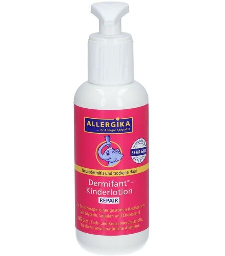 Die Dermifant®-Kinderlotion REPAIR ist eine speziell entwickelte Langzeit-Basistherapie zur Stärkung der Hautbarriere, die besonders in der schubfreien Phase der Neurodermitis und bei trockener Haut Anwendung findet. Diese hochwertige Lotion enthält einen speziellen Wirkkomplex aus Glycerin, Squalan, Cholesterol und Vitamin E, der die Hautbarriere stärkt und intensiv Feuchtigkeit spendet. Dadurch wird die Haut beruhigt und geschützt. Dank ihrer Wasser-in-Öl-Emulsion mit einem Lipidanteil von 26% lässt sich die Dermifant®-Kinderlotion REPAIR leicht und gleichmäßig auf der Haut verteilen. Eine regelmäßige Anwendung dieser Basistherapie kann dazu beitragen, neuen Schüben vorzubeugen und die Haut langfristig zu stabilisieren. Die Wirksamkeit und Verträglichkeit der Dermifant®-Kinderlotion REPAIR wurde dermatologisch-allergologisch an der Haut von Neurodermitikern klinisch getestet. Das Produkt ist frei von Duft-, Farb- und Konservierungsstoffen, Parabenen, Silikonen, Mineralölen, Mikroplastik sowie natürlichen Allergenen. Zudem enthält es keine der 328 häufigsten allergieauslösenden Stoffe der Deutschen Kontaktallergie-Gruppe. Hergestellt in Deutschland, wird die Dermifant®-Kinderlotion REPAIR von Dermatologen, Kinderärzten und Hebammen empfohlen. Sie eignet sich für die großflächige Anwendung am gesamten Körper und ist speziell auf die Bedürfnisse empfindlicher Haut abgestimmt. Langzeit-Basistherapie für schubfreie Phase der Neurodermitis und trockene Haut: Stärkt die Hautbarriere und spendet intensiv Feuchtigkeit. Spezial-Wirkkomplex: Enthält Glycerin, Squalan, Cholesterol und Vitamin E, die die Haut beruhigen und schützen. Wasser-in-Öl-Emulsion: Mit einem Lipidanteil von 26%, lässt sich gut verteilen. Frei von schädlichen Stoffen: Ohne Duft-, Farb- und Konservierungsstoffe, Parabene, Silikone, Mineralöle, Mikroplastik und häufige Allergene. Klinisch getestet und empfohlen: Dermatologisch-allergologisch getestet, empfohlen von Dermatologen, Kinderärzten und Hebammen. Anwendung: Zur Langzeitpflege bei Ekzemen und Neurodermitis. Beugt Juckreiz und neuen Schüben vor. Täglich morgens und abends, insbesondere nach dem Baden, großzügig auf dem Körper verteilen und sanft einmassieren. Kann auch im Wechsel mit Dermifant® -Kinderlotion AKUT eingesetzt werden. Dermifant® -Kinderlotion REPAIR ist auch für Babys geeignet. Inhaltsstoffe: Aqua, Glycerin, Caprylic/Capric Triglyceride, Isopropyl Myristate, Decyl Oleate, Pentylene Glycol, Polyglyceryl-2 Dipolyhydroxystearate, Squalane, Cera Alba, Magnesium Sulfate, Tocopheryl Acetate, Panthenol, Cholesterol, Magnesium Stearate, p-Anisic Acid, Tocopherol, Bisabolol, Helianthus Annuus Seed Oil, Sodium Hydroxide, Hydrogenated Palm Glycerides Citrate *Gutschein gültig bei Online-Bestellung ab dem genannten Mindestbestellwert (ausgenommen preisgebundene Bücher, verschreibungspflichtige Produkte, Artikel von Drittanbietern (Marktplatz Partnern) sowie bei einer Now!-Lieferung)) für die folgenden Produkte des Herstellers... ...