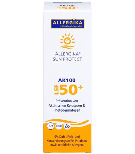 Anwendungsgebiet von Allergika Sun Protect Ak100 Creme Lsf 50+Allergika Sun Protect Ak100 Creme Lsf 50+ – Medizinischer UV-Schutz bei aktinischer Keratose und Hautkrebs-RisikoAllergika Sun Protect Ak100 Creme Lsf 50+ ist ein hochwirksamer Sonnenschutz, speziell entwickelt für die dermatologische Anwendung bei erhöhtem Hautkrebs-Risiko – ideal bei aktinischer Keratose, Lichtdermatosen oder nach dermatologischen Eingriffen. Auch als begleitende Pflege bei medikamentöser Therapie oder nach Laserbehandlungen und Operationen ist dieses Spezialprodukt bestens geeignet.Mit einem Lichtschutzfaktor von über 100 (SPF 50+) bietet es extrem hohen UVA- und UVB-Schutz – ergänzt durch sicheren Schutz vor blauem Licht und Infrarot-Strahlung. Die riff-freundlichen, hormonfreien UV-Filter sorgen für maximale Hautverträglichkeit, selbst bei sehr empfindlicher oder allergischer Haut.Dank der Quick-Absorption-Technologie zieht die Creme besonders schnell ein und hinterlässt ein transparentes Finish – ideal für exponierte Hautpartien wie Gesicht, Kopfhaut, Ohren, Hals, Dekolleté und Hände.Die dermatologisch getestete Rezeptur ist frei von Duft-, Farb- und Konservierungsstoffen sowie von Parabenen, Silikonen, Mineralölen, Mikroplastik und natürlichen Allergenen. Auch die 328 häufigsten Kontaktallergene sind nicht enthalten.Allergika Sun Protect Ak100 Creme Lsf 50+ wird von Dermatologen empfohlen und ist dank des hygienischen Airless-Spenders optimal für die tägliche Anwendung im Gesicht und am Körper geeignet – für umfassenden Schutz und Pflege bei besonders gefährdeter Haut.Wirkstoffe / Inhaltsstoffe / ZutatenAllergika Sun Protect Ak100 Creme Lsf 50+ enthält:Aqua, Diethylamino Hydroxybenzoyl Hexyl Benzoate, Bis-Ethylhexyloxyphenol Methoxyphenyl Triazine, Diethylhexyl Butamido Triazone, Propylheptyl Caprylate, Dibutyl Adipate, Dicaprylyl Carbonate, Ethylhexyl Triazone, Pentylene Glycol, Tris-Biphenyl Triazine (nano), Undecane, Synthetic Fluorphlogopite, Tride ...