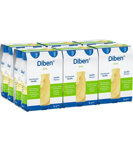 Hochkalorische Trinknahrung bei gestörter Glukosetoleranz Hochkalorisch 1,5 kcal/ml) und eiweißreich (7,5 g/100ml) Reich an einfach ungesättigten Fettsäuren und Ballaststoffen Mit Fischöl Laktosearm und glutenfrei Erhältlich in 3 leckeren Geschmackrichtungen Verordnungsfähig Um täglich fit und leistungsfähig zu sein, benötigt unser Körper Energie und Nährstoffe, die er aus der Ernährung bezieht. In gewissen Lebenssituationen, beispielsweise im gehobenen Alter oder bei be stimmten Erkrankungen, kann die reguläre Nah rungsaufnahme jedoch erschwert sein. Können die wichtigen Vitalstoffe nicht in ausreichender Menge zugeführt werden, besteht das Risiko einer Mangel ernährung und einem erheblichen Gewichtsverlust. Diben® Drinks sind hochkalorische Lebensmittel, die gezielt zum Diätmanagement von Patienten mit einem erhöhten Energie und Eiweißbedarf entwickelt wurden, die gleichzeitig von einer gestörten Glu kosetoleranz, z. B. im Rahmen von Diabetes, betroffen sind. Mit dem regelmäßigen Verzehr der Trinknahrung kann der tägliche Kalorienbedarf und die Zufuhr mit wertvollen Vitaminen, Mineralstoffen und Spuren elementen gewährleistet werden. Trinknahrung mit spezieller Kohlen hydratzusammensetzung Diben® Drinks sind eine trinkfertige Flüssignahrung mit einem niedrigen glykämischen Index, die ins- besondere für Menschen mit einer gestörten Glu kosetoleranz geeignet ist, um den täglichen Energie und Eiweißbedarf zu decken. Die Trinknahrung ist reich an einfach ungesättigten Fettsäuren (MUFA) und zugleich natrium- und cholesterinarm. Die enthaltenen Ballaststoffe unter stützen eine gesunde Verdauung. Zudem ist der gut verträgliche Drink laktosearm und glutenfrei. Diben® Drinks sind in den drei leckeren Ge schmacksrichtungen Vanille, Cappuccino und Wald frucht erhältlich. Für eine bequeme und sichere Anwendung sorgt die praktische EasyBottle: Die Flaschen sind für eine einfache Handhabung konzipiert und leicht zu öffnen, griffsicher und gegen Wegrollen geschützt. NÄHRSTOFFMANGEL Eine gesunde, ausgewogene Ernährung spielt eine entscheidende Rolle für Gesundheit und Wohlbefinden. Essen wir hingegen nur wenig oder ist der Speiseplan zu einseitig, fehlen dem Körper die notwendige Energie und wichtige Vitalstoffe. Die Folgen des Nährstoff mangels: Man fühlt man schnell schlapp, müde und antriebslos, leidet häufiger an Infekten oder erholt sich nach Krankheiten nur langsam. Ist die normale Nahrungsaufnahme in bestimmten Situationen nur eingeschränkt möglich, eignen sich Diben® Drinks mit einer hohen Energie und Ei weißdichte, Vitaminen und Mineralstoffen als gezielte Nahrungsergänzung. DIABETES Patienten mit Diabetes sind von einer gestörten Regulation des Blutzuckerspiegels betroffen. Gefähr lich sind für Diabetiker sowohl zu hohe wie auch zu niedrige Blutzuckerwerte. Deshalb sind eine eng maschige Kontrolle der Werte und ein gezielter Ernährungsplan erforderlich. Die Diben® Trinknahrung lässt sich gut in das Diät management integrieren. Dank... ...