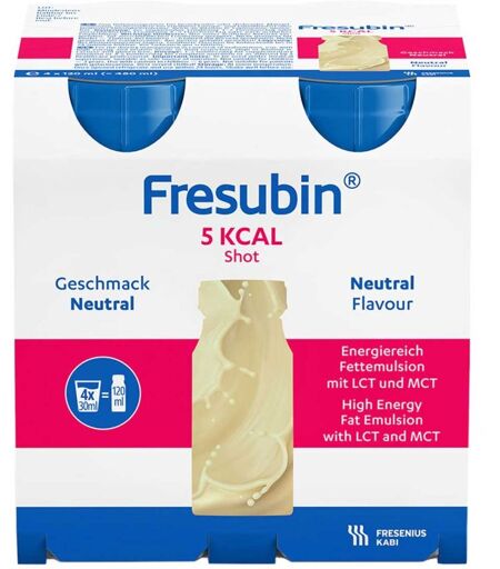 Anwendungsgebiet von Fresubin 5 kcal Shot Neutral LösungFresubin 5 kcal Shot Neutral Lösung ist eine Emulsion zur Energieanreicherung. Sehr energiereiche fetthaltige Trinknahrung als Ergänzung zum Essen.