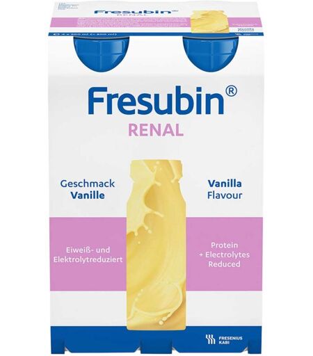 Anwendungsgebiet von Fresubin renal Vanille Easy DrinkFresubin renal Vanille Easy Drink ist eine Trinknahrung speziell für nicht-dialysepflichtige Patienten mit chronischer und akuter Niereninsuffizienz. Es ist zur Nahrungsergänzung wie auch zur ausschließlichen Ernährung geeignet und bei einer vorliegenden Niereninsuffizienz verordnungsfähig. Abgestimmt auf die besondere Stoffwechselsituation bei unzureichender Nierenfunktion wird die Energiezufuhr unterstützt und der Anfall an belastenden Abbauprodukten reduziert. Die trinkfertige Flüssignahrung mit leckerem Vanillegeschmack wird in einer ergonomisch geformten Flasche mit Trinkhilfe angeboten und garantiert somit eine einfache Anwendung. Die Ernährung spielt eine zentrale Rolle für unseren Gesundheitszustand, sie versorgt den Körper täglich mit Energie und lebensnotwendigen Nährstoffen. Bei Patienten mit eingeschränkter Nierenfunktion gestaltet sich die ausreichende Zufuhr von Kalorien und Vitalstoffen jedoch oftmals schwierig. Im Rahmen einer Ernährungstherapie kann Flüssignahrung als hilfreiche Unterstützung dienen, um die Nährstoffversorgung sicherzustellen. Wirkungsweise von Fresubin renal Vanille Easy DrinkDie Zusammensetzung von Fresubin renal Vanille Easy Drink ist auf die speziellen Patientenbedürfnisse angepasst: Sie hat einen hohen Energiegehalt, mit nur einer Flasche werden dem Körper 400 Kalorien zugeführt. Die Trinknahrung ist eiweißreduziert (nur 6 g pro 200 ml) und elektrolytreduziert, auch der Mineralstoffgehalt ist auf die Anforderungen von Patienten mit Niereninsuffizienz abgestimmt, dank der speziellen Aufbereitung können die Nährstoffe vom Darm schnell resorbiert werden. Wirkstoffe / Inhaltsstoffe / ZutatenFresubin renal Vanille Easy Drink enthält: Zutaten: Vanille: Wasser, Maltodextrin, Isomaltulose°, pflanzliche Öle (Rapsöl, Sonnenblumenöl), Tapiokadextrin, Milcheiweiß, mittelkettige Triglyceride (MCT), Emulgatoren ...