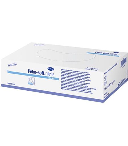 Peha-soft® nitrile guard powderfree Der latexfreie Untersuchungs- und Schutzhandschuh aus synthetischem Nitrilkautschuk mit der langen Stulpe Latexfreie Einmal-Untersuchungs- und Schutzhandschuhe aus weichem, blau gefärbtem Nitrilkautschuk, puderfrei mit extra langer Stulpe für optimalen Schutz durch chlorierte Innenbeschichtung leicht anzuziehen texturierter Fingerbereich für optimale Griffigkeit hochelastisch und besonders reißfest hervorragende Passform und ausgezeichnetes Tastempfinden links und rechts zu tragen. Anwendung: Als strapazierfähiger medizinischer Handschuh zum einmaligen Gebrauch in allen Bereichen, in denen das Personal durch Kontamination gefährdet ist. Insbesondere geeignet für Personen, die auf Handschuhpuder überempfindlich reagieren oder mit Allergien gegen Latexproteine (Typ-I-Allergie). Medizinprodukt nach EN 455 und Persönliche Schutzausrüstung nach EN 374 Kategorie III für den Einsatz im Labor und beim Umgang mit Chemikalien und Desinfektionsmitteln. Zugelassen für den Kontakt mit Lebensmitteln. ...