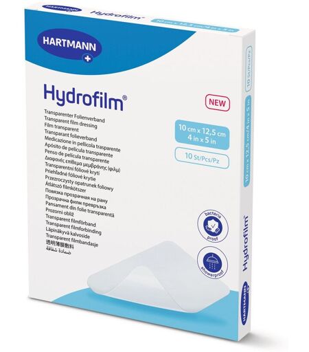 HARTMANN Hydrofilm® 10 cm x 12,5 cm Selbsthaftender transparenter Folienverband, aus keim- und wasserdichter, semipermeabler Polyurethan-Folie, mit hautfreundlichem Kleber für das praktisch schmerzfreie Abziehen. ...