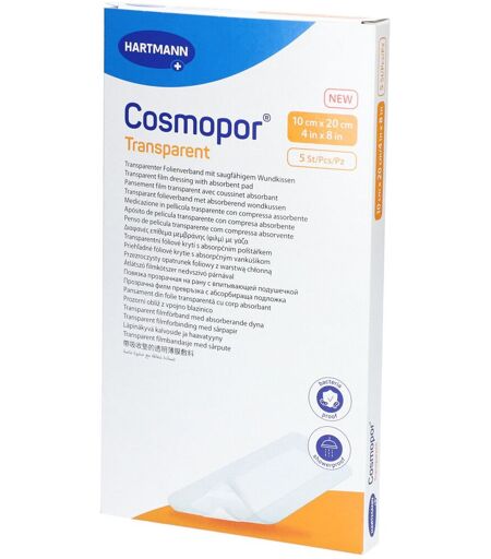 COSMOPOR transparent Folienverband 10x20 cm steril Zweckbestimmung: Cosmopor® transparent kann in der postoperativen Versorgung von leicht exsudierenden Wunden, als Schutz gegen das Eindringen von Bakterien und als Verband bei kleineren Verletzungen verwendet werden Zusammensetzung: Das Wundkissen besteht aus Viskosefaser und ist mit einem Polyethylen-Netz bedeckt, das als nicht verklebende Wundkontaktschicht dient ...