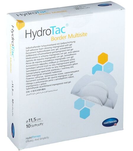 HydroTac Border Multisite 11,5 cm Größe Wundauflage: 11,5 cm Selbsthaftender Schaumverband mit Gelbbesichtung Anwendung Reinigen Sie die Wunde und entfernen Sie sanft kleine Fremdkörper oder Verschmutzungen Trocknen Sie die Haut um die Wunde vorsichtig ab. Bringen Sie das Pflaster an, ohne es zu dehnen und vermeiden Sie Faltenbildung ...