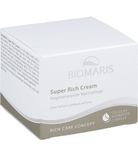 Anwendungsgebiet von Biomaris Super Rich Cream Ohne ParfumDie nährende Pflegecreme Biomaris Super Rich Cream Ohne Parfum mit Detox-Effekt unterstützt die Reduzierung feiner Linien und verfeinert sichtbar die Hautstruktur sowie deren Elastizität. Dank wertvollem MeeresTIEFwasser in Kombination mit dem Cellular Hydration Complex wird die Haut intensiv mit Feuchtigkeit versorgt und diese langanhaltend gespeichert. Während Sie schlafen, entfaltet die Nachtpflege ihre regenerierende Wirkung. Bei besonders pflegebedürftiger Haut können Sie die Biomaris Super Rich Cream Ohne Parfum auch ideal als Tagespflege verwenden.Wirkstoffe / Inhaltsstoffe / ZutatenBiomaris Super Rich Cream Ohne Parfum enthält:Aqua [Water], Maris Aqua [Sea Water], Caprylic/Capric Triglyceride, Glycerin, Squalane, Butyrospermum Parkii (Shea) Butter, Polyglyceryl-3 Polyricinoleate, Persea Gratissima (Avocado) Oil, Undecane, Polyglyceryl-3 Diisostearate, Tridecane, Zinc Stearate, Zinc Sulfate, Porphyridium Cruentum Extract, Magnolia Officinalis Bark Extract, Salicornia Herbacea Extract, Tocopherol, Hippophae Rhamnoides Oil, Maltodextrin, Cera Alba [Beeswax], Helianthus Annuus (Sunflower) Seed Oil, Citrus Paradisi (Grapefruit) Fruit Extract, Alcohol, Rosmarinus Officinalis (Rosemary) Leaf Extract, Hydrogenated Rapeseed Oil, Glyceryl Caprylate, Citric Acid, Hydrogenated Palm Oil, Sodium Anisate, Sodium Levulinate.GegenanzeigenBei bekannter Überempfindlichkeit gegenüber einem der oben genannten Inhaltsstoffe sollte das Produkt nicht angewendet werden.DosierungAnwendungsempfehlung von Biomaris Super Rich Cream Ohne Parfum: Abends auf die gereinigte Haut von Gesicht, Hals und Dekolleté auftragen. Bei sehr anspruchsvoller Haut ist die Biomaris Super Rich Cream Ohne Parfum auch als Tagespflege geeignet. Biomaris Super Rich Cream Ohne Parfum können in Ihrer Versandapotheke www.juvalis.de erworben werden. ...