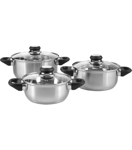 Aus hochwertigem, rostfreiem Edelstahl Energiesparend durch gleichmäßige und schnelle Wärmeverteilung 3 Töpfe mit Glasdeckel inkl. Dampfauslass - für praktisches Sichtkochen und kontrolliertes Austreten von Wasserdampf Hitzebeständige Phenolharz-Griffe für besseres Hantieren Geeignet für alle Herdarten – inkl. Induktion Ofenfest bis 150 °C Spülmaschinengeeignet 6-teilig Produktmerkmale table{width:100%;}td{padding-right: 30px; padding: 0.5rem; border-bottom: 0.0625rem solid #e3e4e5;} tr:nth-child(odd) {background-color: #F2F3F4;} Bestandteile: 3x Töpfe; 3x Deckel Material: Edelstahl, Aluminiun, Kunststoff, Glas Wärmeleitfähigkeit: keine Angabe Bodenstärke: ca. 1,9 mm Beschichtung: keine Angabe Deckel: ja Griff: ja Schüttrand: nein Geeignet für: alle Herdarten – inkl. Induktion Hitzebeständigkeit: bis ca. 150 °C Nutzvolumen: ca. 1,2 l, ca. 1,8 l, ca. 2,6 l Mess-Skala: nein Spülmaschinengeeignet: ja Maße: ca. Ø 16 x H 7,5 cm, ca. Ø 18 x H 8,5 cm, ca. Ø 20 x H 9,5 cm Lieferumfang: 3x Töpfe; 3x Deckel ...