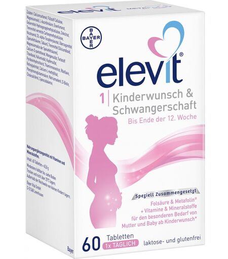Anwendungsgebiet von Elevit 1 Kinderwunsch & Schwangerschaft TablettenNährstofftabletten ab Kinderwunsch und Schwangerschaft. Die Vorteile von Elevit® 1 30 Tabletten Nährstoffe ab Kinderwunsch und im ersten Schwangerschaftsdrittel: unterstützt den erhöhten Nährstoffbedarf ab Kinderwunsch und im ersten Schwangerschaftsdrittel versorgt auch die Frauen mit Folat, die Folsäure nur eingeschränkt verstoffwechseln können, durch die Kombination von Folsäure mit Metafolin®1 reduziert mit 800 Mikrogramm Folat (400 Mikrogramm Folsäure und 400 Mikrogramm Metafolin®1) das Risiko von Neuralrohrdefekten ohne Laktose & Gluten einfache Einnahme: nur eine Tablette pro Tag Ein Kind zu bekommen, klappt nicht immer auf Anhieb – manchmal dauert es bis sich eine Schwangerschaft einstellt. Mit Elevit 1 Kinderwunsch & Schwangerschaft Tabletten müssen Sie sich um die dafür benötigten Nährstoffe nicht mehr so viele Gedanken machen: Eine Tablette pro Tag unterstützt den erhöhten Nährstoffbedarf ab dem Kinderwunsch und im ersten Schwangerschaftsdrittel. Durch die Kombination von Metafolin®1 und Folsäure liefert es ausreichend Folat (800 Mikrogramm). Das ist besonders vorteilhaft für Frauen, deren Folsäure-Verwertung gestört ist, und reduziert das Risiko für Neuralrohrdefekte beim Baby. Der zusätzliche Vorteil: Elevit® 1 ist frei von Laktose und Gluten. Ab dem Zeitpunkt Ihres Kinderwunsches: Elevit® 1. Der richtige Zeitpunkt für die Zeugung, Stress vermeiden, Bewegung – viele Paare fragen sich, was sie tun können, um ihren Kinderwunsch zu verwirklichen. Ein elementarer Baustein ist eine gesunde und ausgewogene Ernährung. Mit der Einnahme von Elevit® 1 können Frauen die Deckung ihres erhöhten Nährstoffbedarfs während dieser Zeit unterstützen – es handelt sich dabei um ein speziell zusammengesetztes Nahrungsergänzungsmittel mit Folsäure, Metafolin®1, Zink und weiteren wertvollen Vit ...