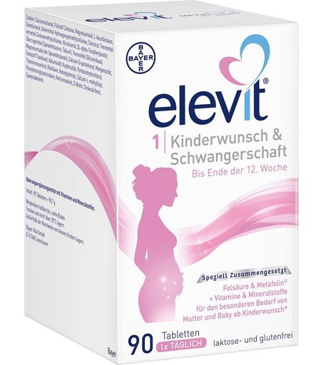 Nahrungsergänzungsmittel sind kein Ersatz für eine ausgewogene und abwechslungsreiche Ernährung und eine gesunde Lebensweise.Nährstofftabletten ab Kinderwunsch und Schwangerschaft Ein Kind zu bekommen, klappt nicht immer auf Anhieb – manchmal dauert es bis sich eine Schwangerschaft einstellt. Mit Elevit® 1 müssen Sie sich um die dafür benötigten Nährstoffe nicht mehr so viele Gedanken machen: Eine Tablette pro Tag unterstützt den erhöhten Nährstoffbedarf ab dem Kinderwunsch und im ersten Schwangerschaftsdrittel. Durch die Kombination von Metafolin®1 und Folsäure liefert es ausreichend Folat (800 Mikrogramm). Das ist besonders vorteilhaft für Frauen, deren Folsäure-Verwertung gestört ist, und reduziert das Risiko für Neuralrohrdefekte beim Baby. Der zusätzliche Vorteil: Elevit® 1 ist frei von Laktose und Gluten.Ab dem Zeitpunkt Ihres Kinderwunsches: Elevit® 1Der richtige Zeitpunkt für die Zeugung, Stress vermeiden, Bewegung – viele Paare fragen sich, was sie tun können, um ihren Kinderwunsch zu verwirklichen. Ein elementarer Baustein ist eine gesunde und ausgewogene Ernährung. Mit der Einnahme von Elevit® 1 können Frauen die Deckung ihres erhöhten Nährstoffbedarfs während dieser Zeit unterstützen – es handelt sich dabei um ein speziell zusammengesetztes Nahrungsergänzungsmittel mit Folsäure, Metafolin®1, Zink und weiteren wertvollen Vitaminen sowie Mineralstoffen.Elevit® 1 unterstützt ab dem Kinderwunsch zum Beispiel mit Zink Ihre normale Fruchtbarkeit und versorgt Sie im ersten Schwangerschaftsdrittel mit wichtigen Nährstoffen, wie der Folsäure, die das Risiko für Neuralrohrdefekte senken kann und damit für eine gesunde Entwicklung des Babys wichtig ist. Die Tabletten enthalten 800 Mikrogramm Folat (davon 400 Mikrogramm Metafolin®1 und 400 Mikrogramm Folsäure), Zink, Selen, Eisen und 16 weitere, speziell kombinierte Vitamine, Spurenelemente und Mineralstoffe. helfen, den Mehrbedarf an Nährstoffen zu decken, der bei einem Kinderwunsch und im ersten Schwangerschaftsdrittel besteht. reduzieren durch die Folsäure das Risiko von Neuralrohrdefekten beim Baby. sind frei von Laktose und Gluten.Das Nahrungsergänzungsmittel Elevit® 1 ist in der Packungsgröße mit 30 und 90 Tabletten rezeptfrei erhältlich.Sie möchten auch umfangreich versorgt sein? Die Anwendung erfolgt ganz einfach: Sie brauchen täglich nur eine Tablette mit reichlich Wasser einzunehmen. Nach vier Wochen kann mit Elevit® 1 ein präventiver Folatlevel im Blut erreicht werden, der für eine Risikominimierung von Neuralrohrdefekten als erforderlich angesehen wird. Da sich das Neuralrohr bereits im ersten Monat der Schwangerschaft verschließt, sollten Sie mit der Einnahme von Elevit® 1-Tabletten bereits bei Kinderwunsch mindestens vier Wochen vor der geplanten Schwangerschaft beginnen. Zur weiteren Unterstützung der Entwicklung des Embryos sollten Sie Elevit® 1 bis zum Ende der 12. Schwangerschaftswoche einnehmen und dann auf Elevit® 2 umsteigen, welches an die Nährstoffbedürfnisse der... ...